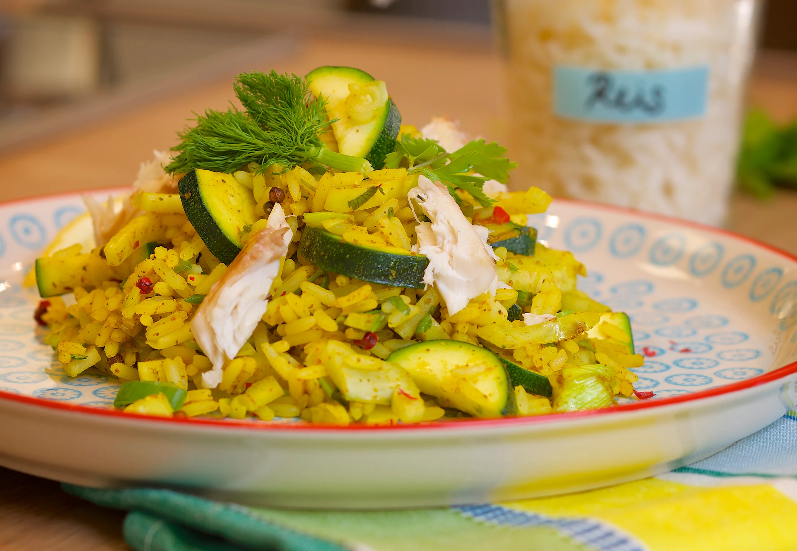 Reis in 300 ml Salzwasser bissfest kochen. Gemüse putzen, Knoblauch schälen. Den weißen Teil der Jungzwiebel in dünne Ringe, Knoblauch fein, Zucchini und Fenchel in Scheiben schneiden. Knoblauch und weißen Teil der Jungzwiebel in 1 TL Öl anschwitzen, Koriander kurz mitrösten, Zucker einrühren. Fenchel und Zucchini zugeben, Gemüse bei mittlerer Hitze ca. 3 Minuten braten.