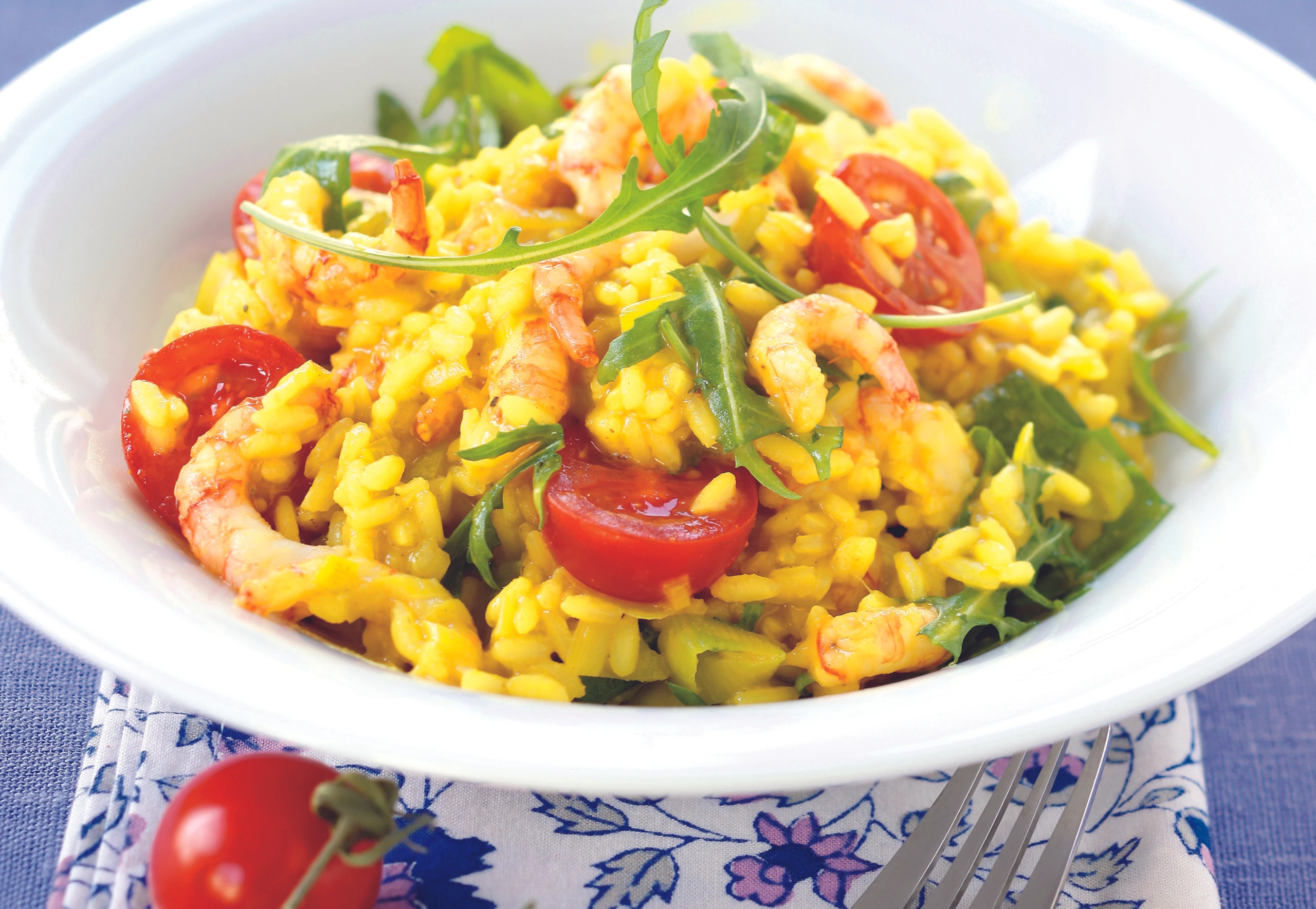 - Paradeiser je nach Größe halbieren oder vierteln. Shrimps in 2 EL Olivenöl anschwitzen, Paradeiser zugeben und kurz mitbraten. Risotto mit Paradeisern, Shrimps, Rucola und restlicher Butter vermischen, zudecken und ca. 1 Minute am Herdrand ziehen lassen.