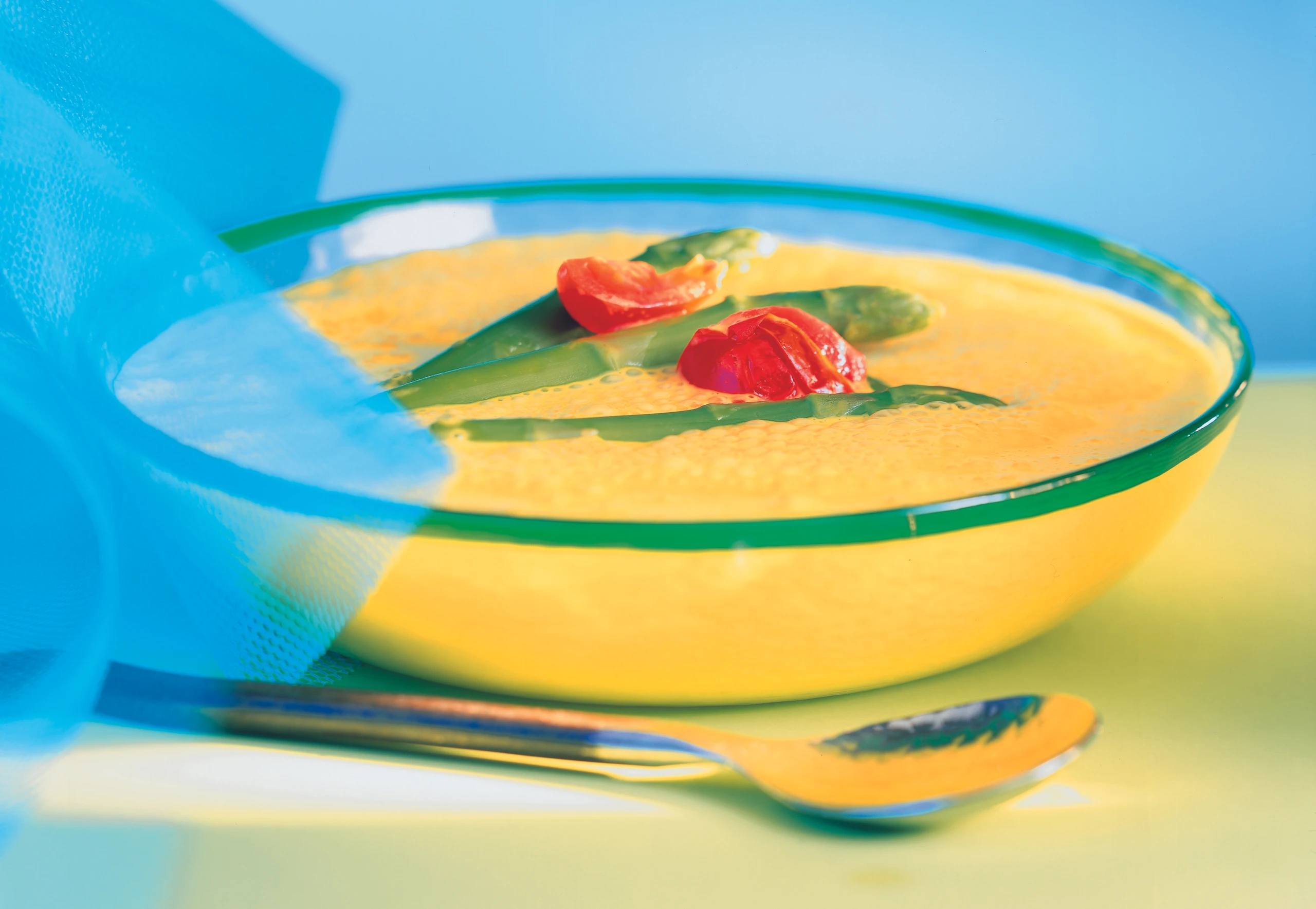 Suppe mit Koriander verrühren, dann mit einem Stabmixer fein pürieren. Die Currysuppe mit Spargel und Paradeisern als Einlage anrichten.