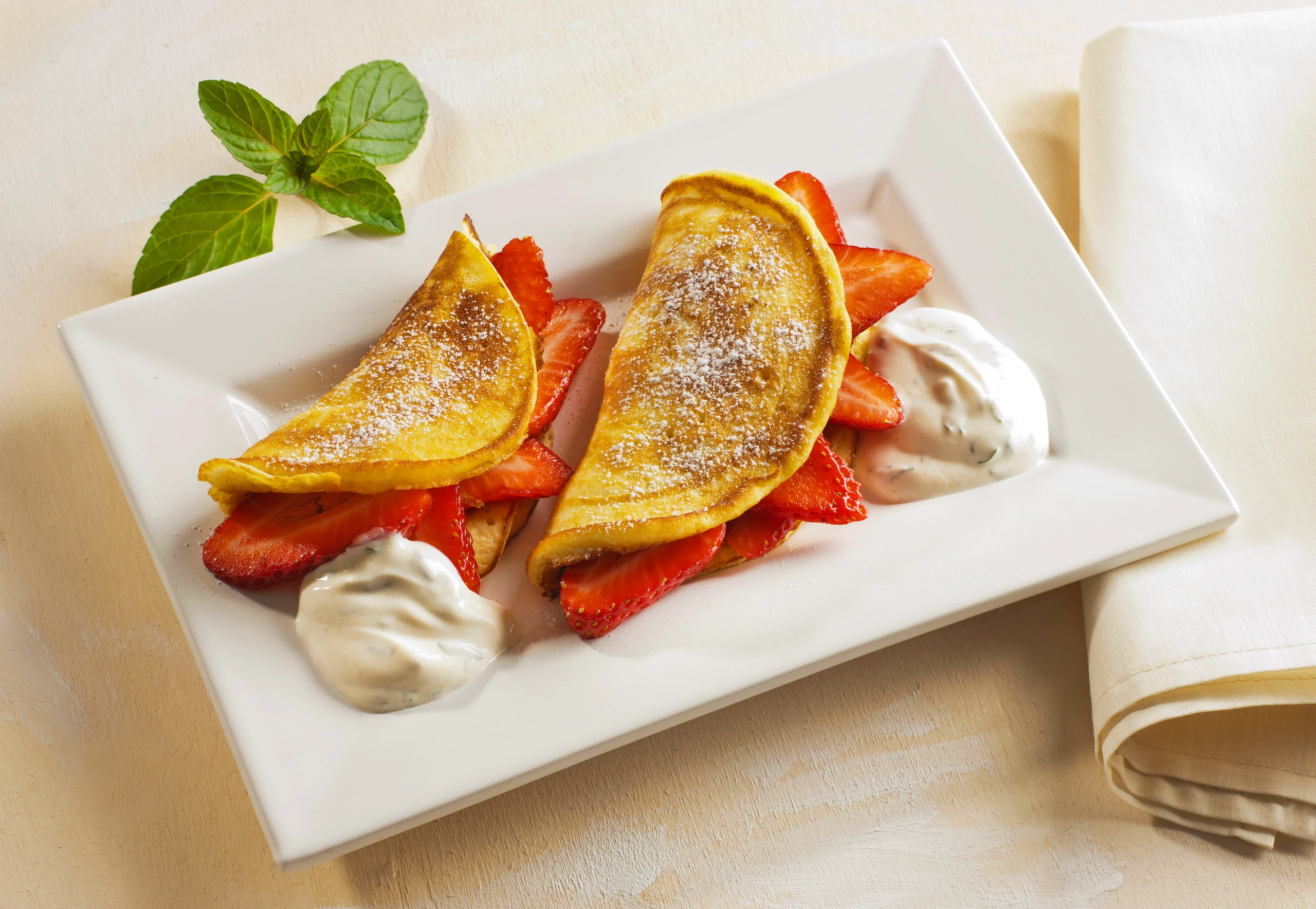 - Dalken zur Hälfte mit Erdbeeren belegen, zweite Hälfte darüber schlagen und behutsam andrücken. Dalken mit der Sauce anrichten und mit Staubzucker bestreut servieren.