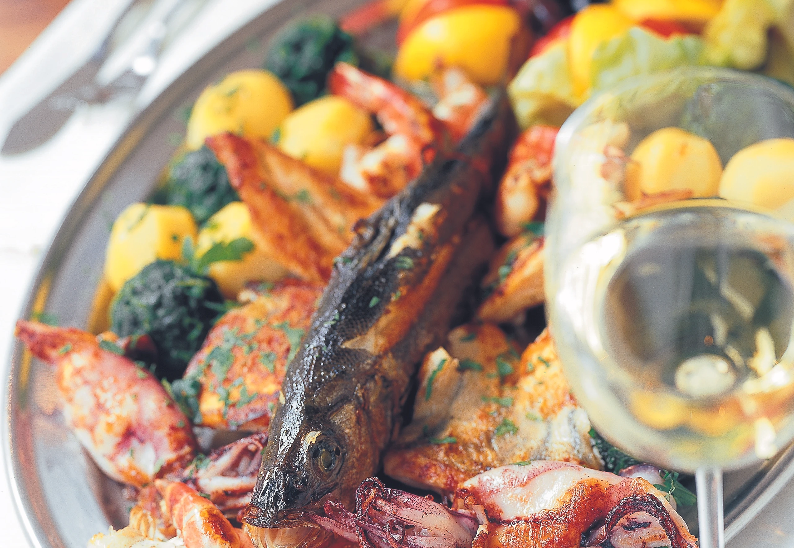Garnelen am „Rücken“ einschneiden und aufklappen. Branzino innen und außen salzen und ca. 15 Minuten grillen (dabei 3 Mal umdrehen). Zander- und Petersfischfilets salzen und ca. 10 Minuten grillen. Calamare und Garnelen beidseitig je ca. 5 Minuten grillen (Garnelen auf der „Fleischseite“ zuerst).