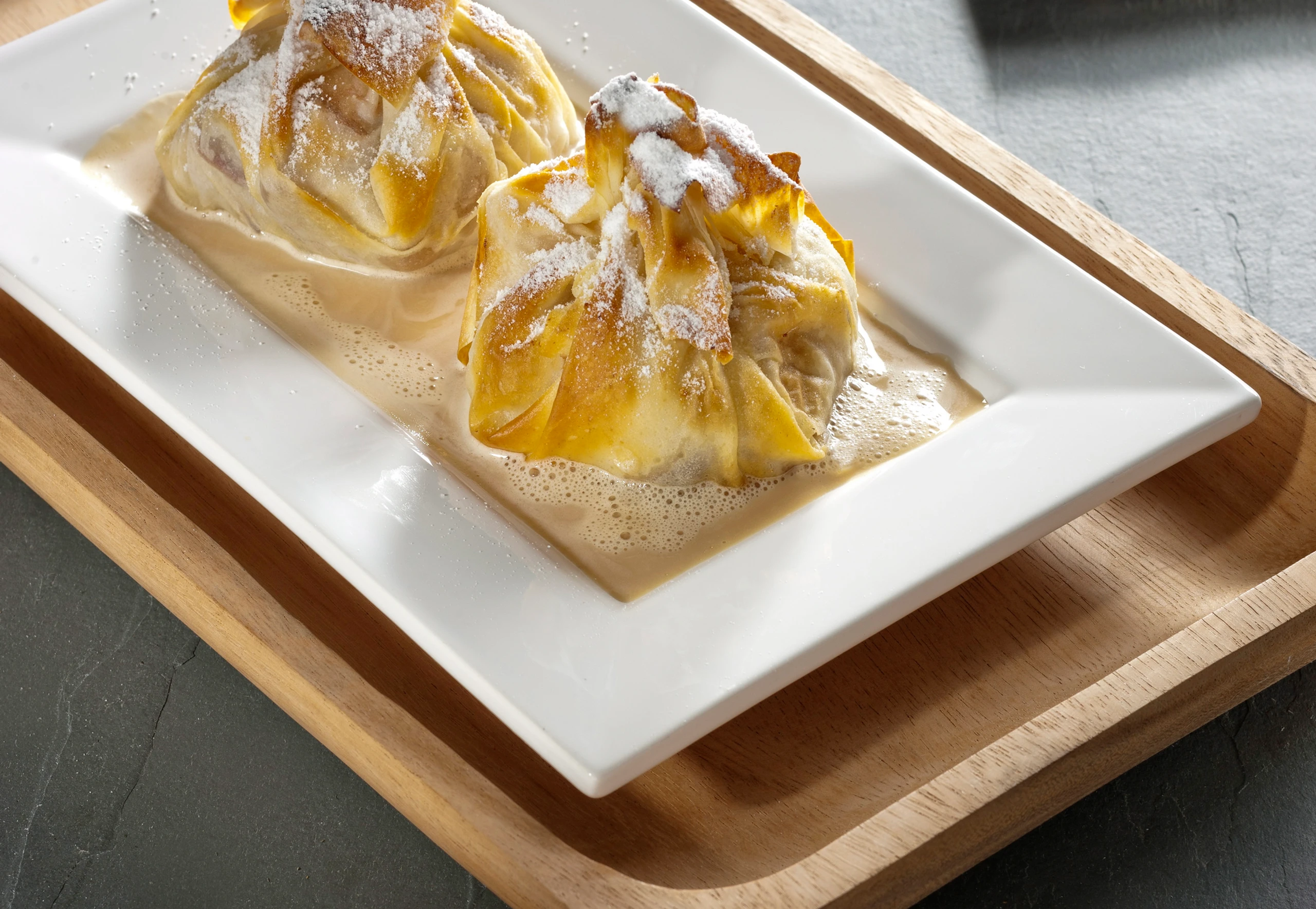 Ein Strudelblatt auf ein feuchtes Tuch legen, mit Butter bestreichen, zweites darauflegen, mit Butter bestreichen. Teig vierteln, Fülle jeweils in die Mitte setzen. Ecken zur Mitte hochziehen und zusammendrücken. Säckchen auf das Blech setzen und im Rohr (mittlere Schiene) ca. 8 Minuten backen.