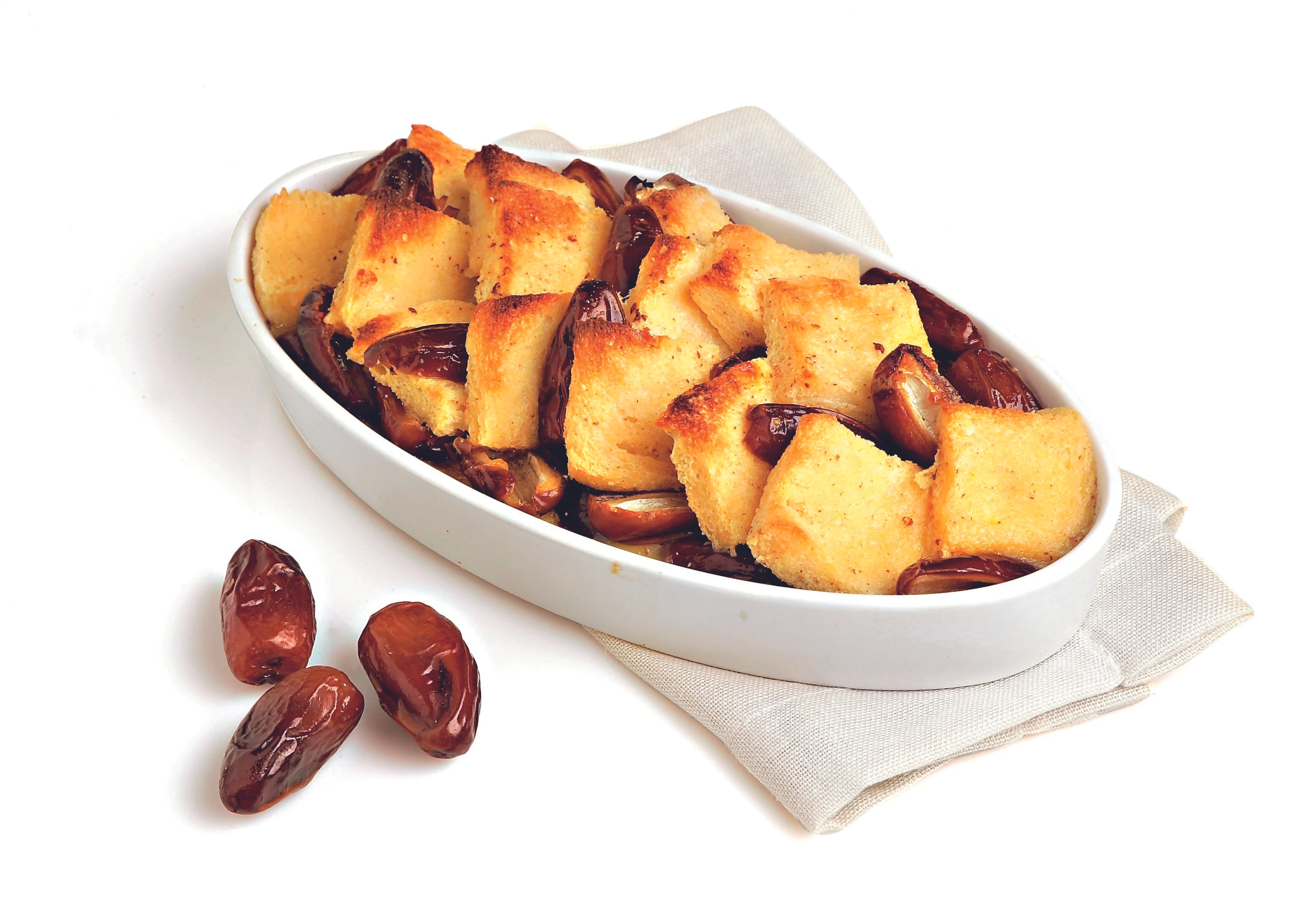 Brot entrinden, in je 4 Rechtecke schneiden. Brotstücke in die Royal tauchen und abwechselnd mit den Datteln in die Form legen.