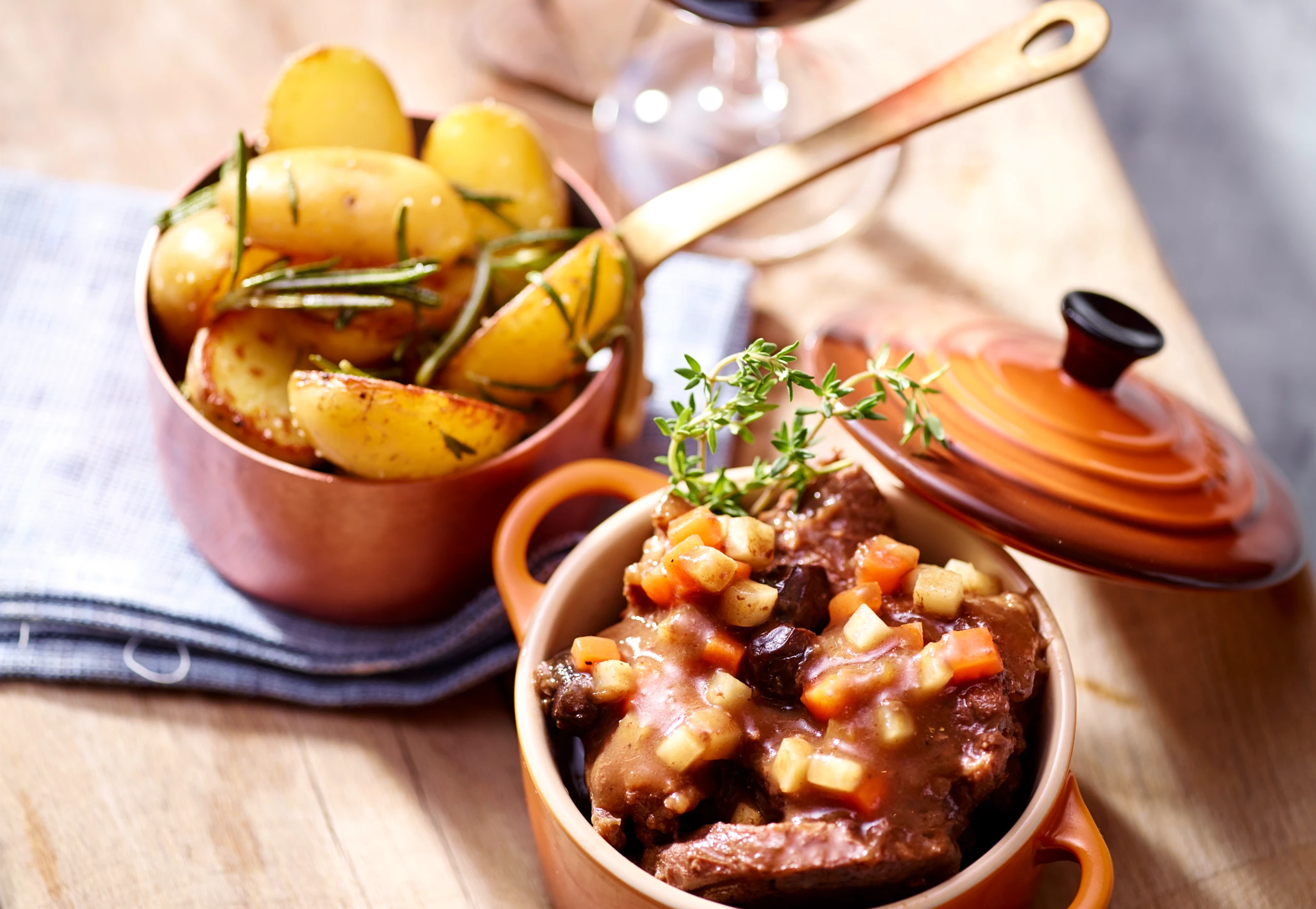 Hitze reduzieren, Paradeiser, Oliven, Thymian, Lorbeer, Knoblauch und Rinderjus zugeben. Ragout köcheln, bis das Fleisch weich ist (ca. 2 Stunden); übrigen Wein nach und nach zugießen. Hitze reduzieren, Paradeiser, Oliven, Thymian, Lorbeer, Knoblauch und Demi Glace zugeben. Ragout köcheln, bis das Fleisch weich ist (ca. 2 Stunden); übrigen Wein nach und nach zugießen.