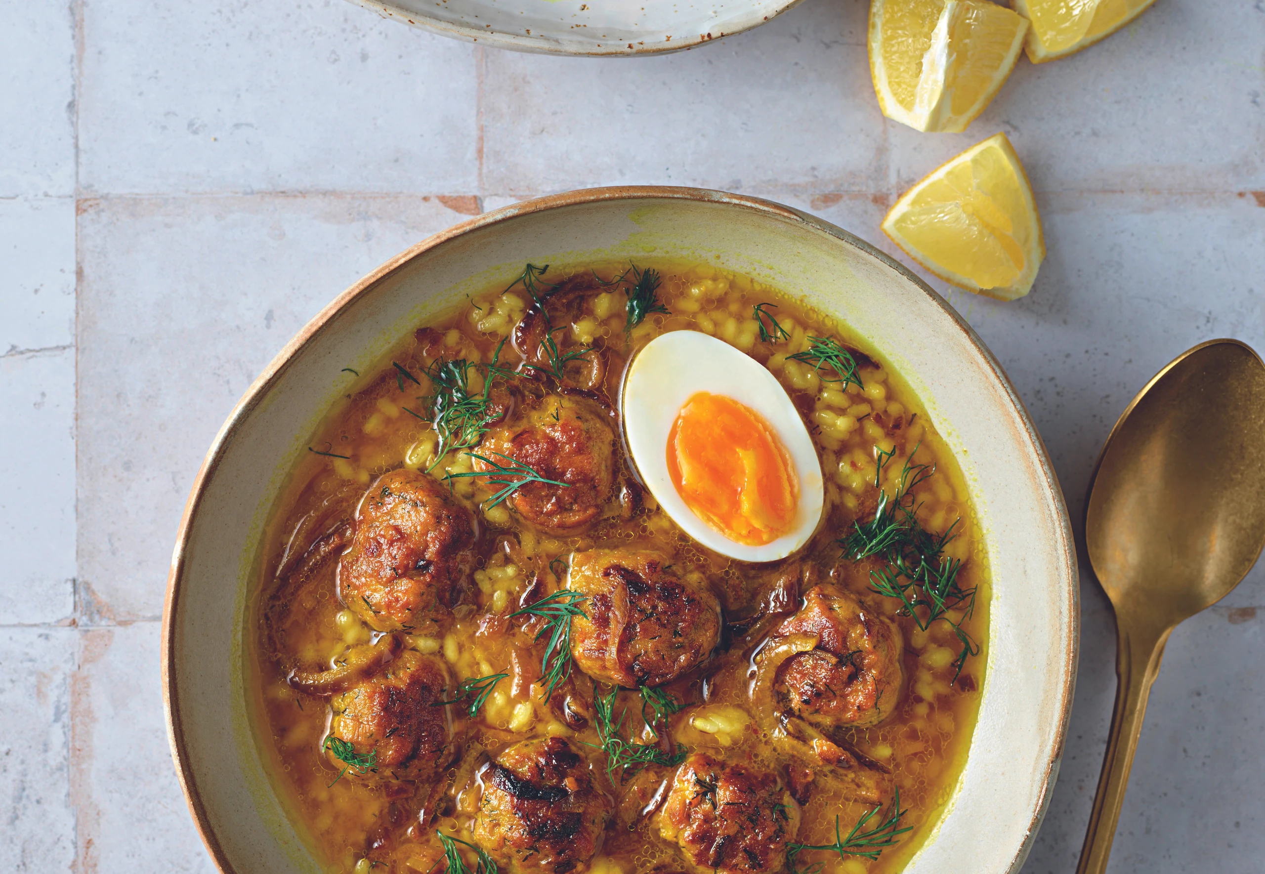 In einem Topf die Hälfte des Olivenöls erhitzen, Zwiebelringe darin goldig anschwitzen. Mit restlichem Kurkuma bestreuen und kurz mitrösten. Aus der Pfanne nehmen, im Bratrückstand übriges Öl erhitzen, Bällchen darin rundum kräftig anbraten. Auf mittlere Hitze herunterschalten, Zwiebelringe auf den Bällchen verteilen und mit heißer Suppe aufgießen. Leicht köcheln, bis die Bällchen gar sind.