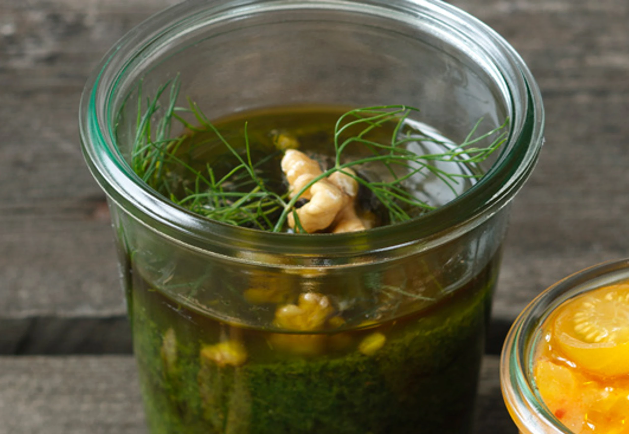 Dille abzupfen und grob hacken, Pecorino reiben, Nüsse fein hacken. Kapern abtropfen lassen, mit Dille und Öl pürieren, mit Köse und Nüssen vermischen, mit Salz und Pfeffer abschmecken.