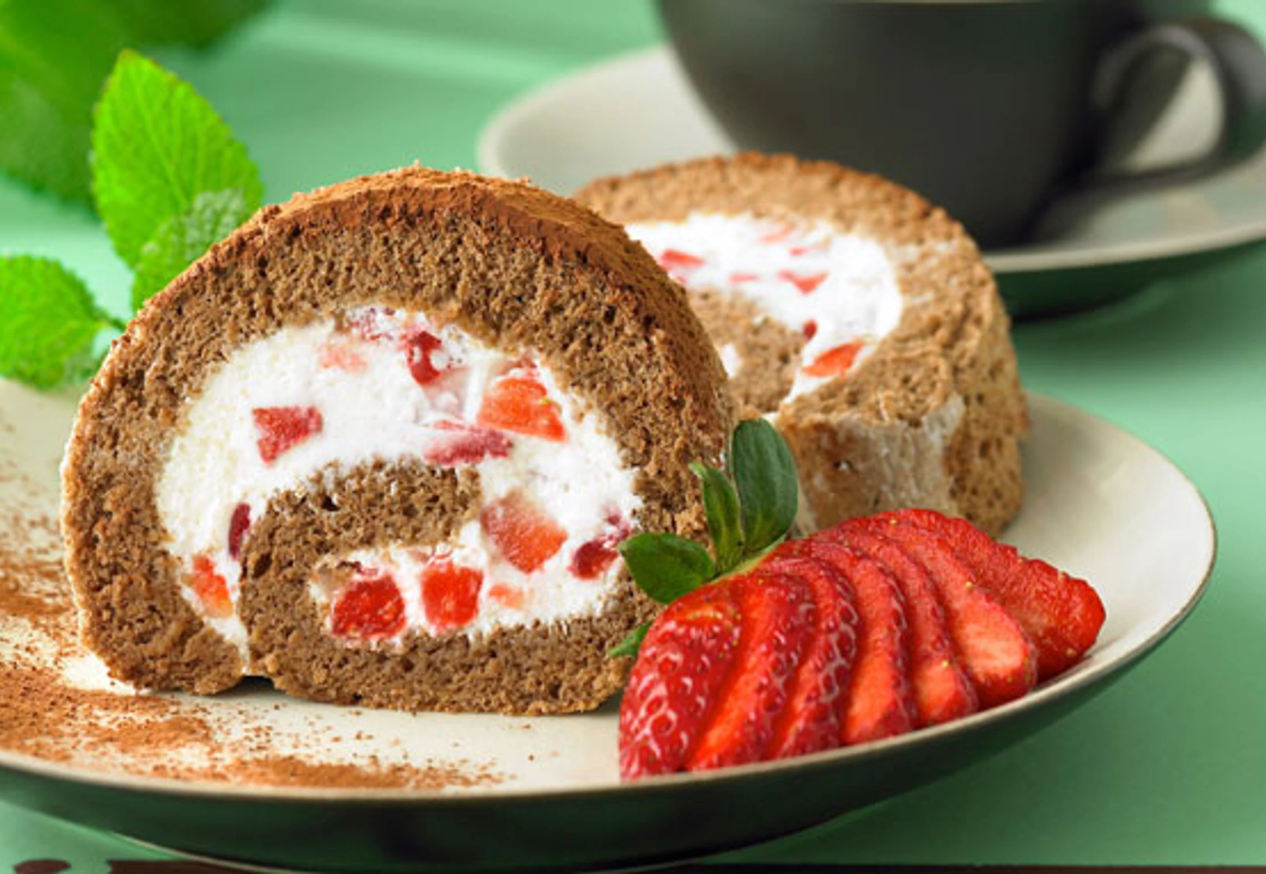 - Biskuit aufrollen, mit Creme bestreichen, mit Erdbeeren belegen und vorsichtig einrollen. Roulade für mindestens 2 Stunden kühl stellen. Zum Anrichten mit Kakao bestreuen.