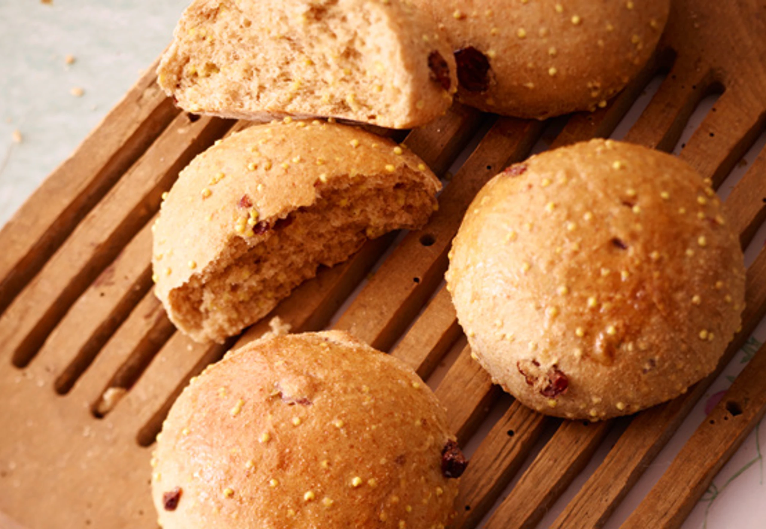 - Backblech mit Backpapier belegen. Teig mit Hirse und Cranberries glatt verkneten, zu einer Rolle formen und in 10 Stücke schneiden. Teigstücke mit der gewölbten Hand unter Druck zu glatten Kugeln formen, auf das Blech geben und ins kalte Backrohr (mittlere Schiene) schieben. Rohr auf 200°C schalten, Weckerln ca. 30 Minuten backen.
