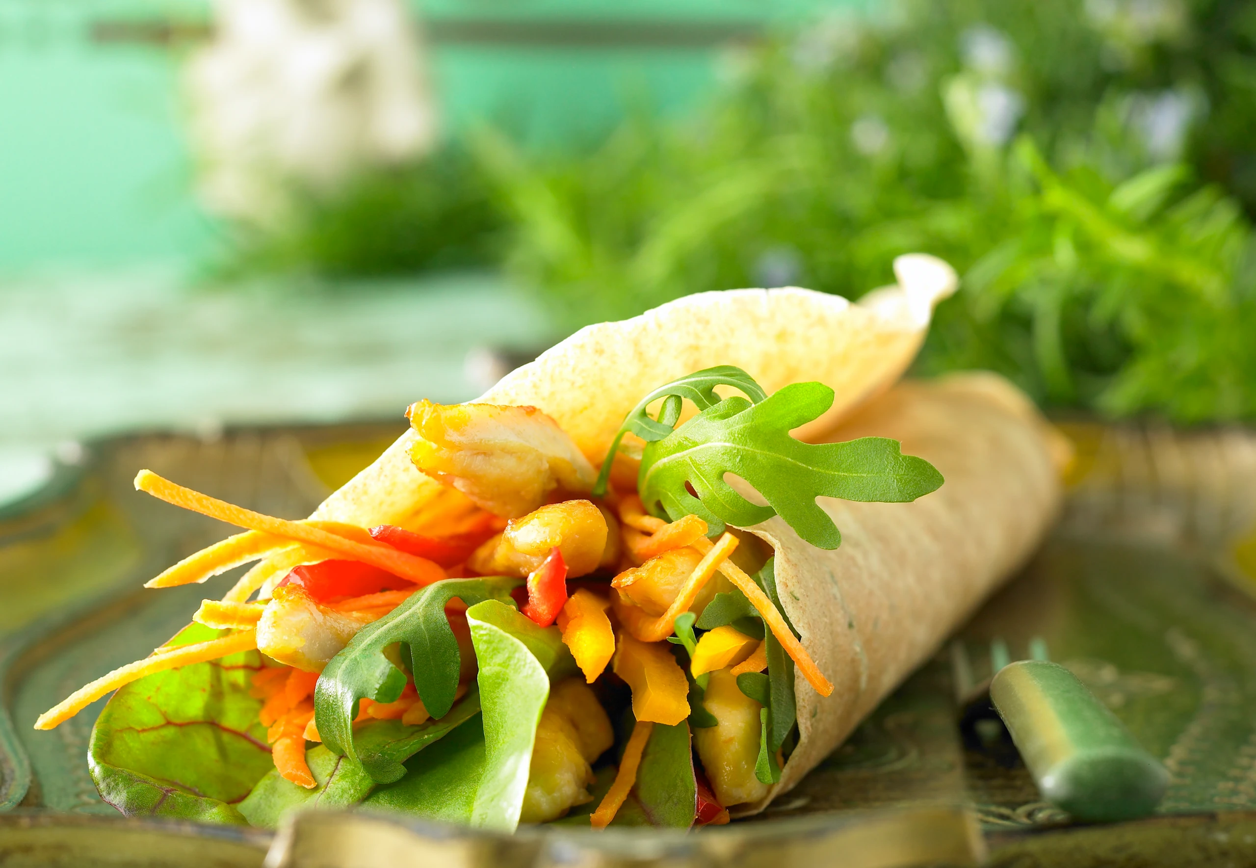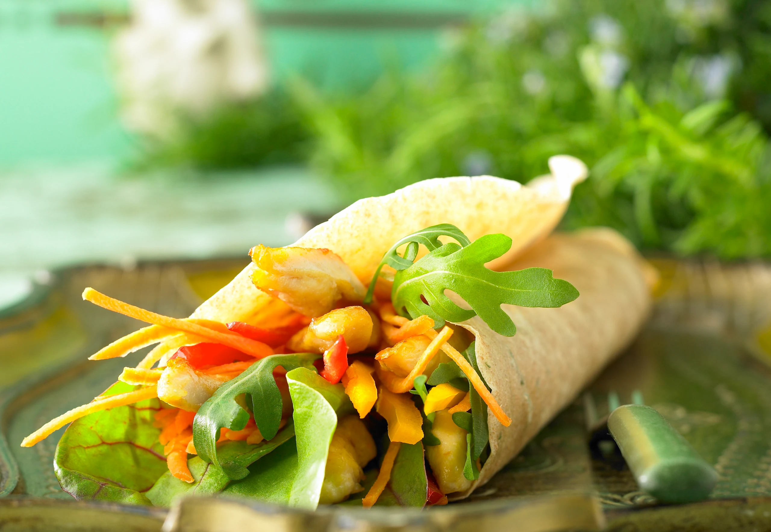 Fleisch in Streifen schneiden. Gemüse, Salat und Fleisch auf den Wraps verteilen. Wraps einrollen.