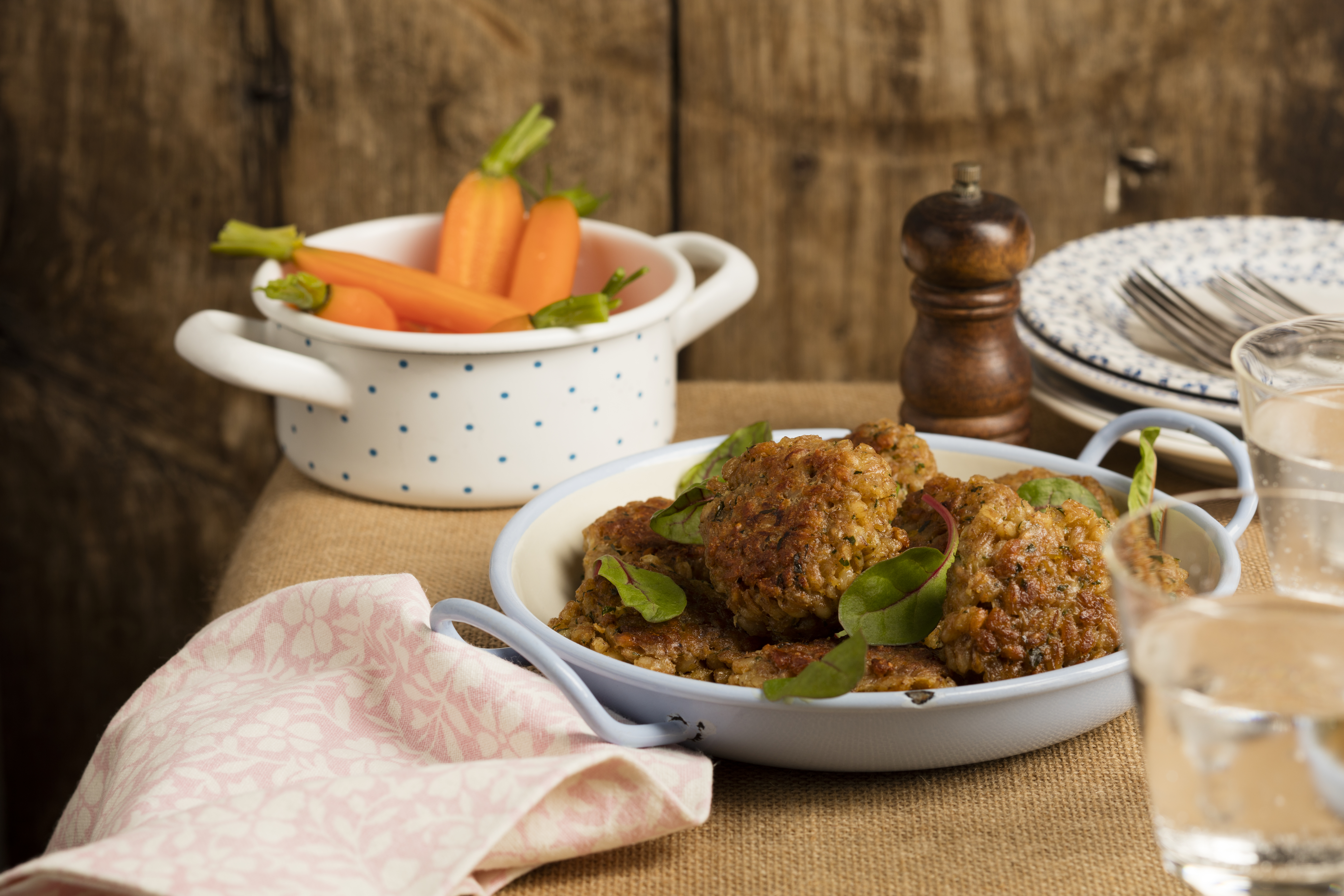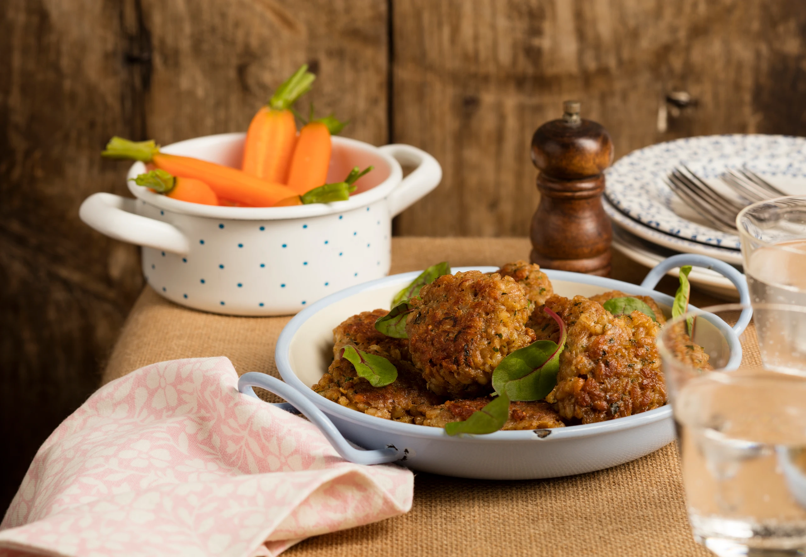 Dinkelmasse ein wenig abkühlen lassen. Dotter, Mehl und Petersilie einrühren, Masse salzen und pfeffern. Aus der Masse mit befeuchteten Händen 12 Laibchen formen.