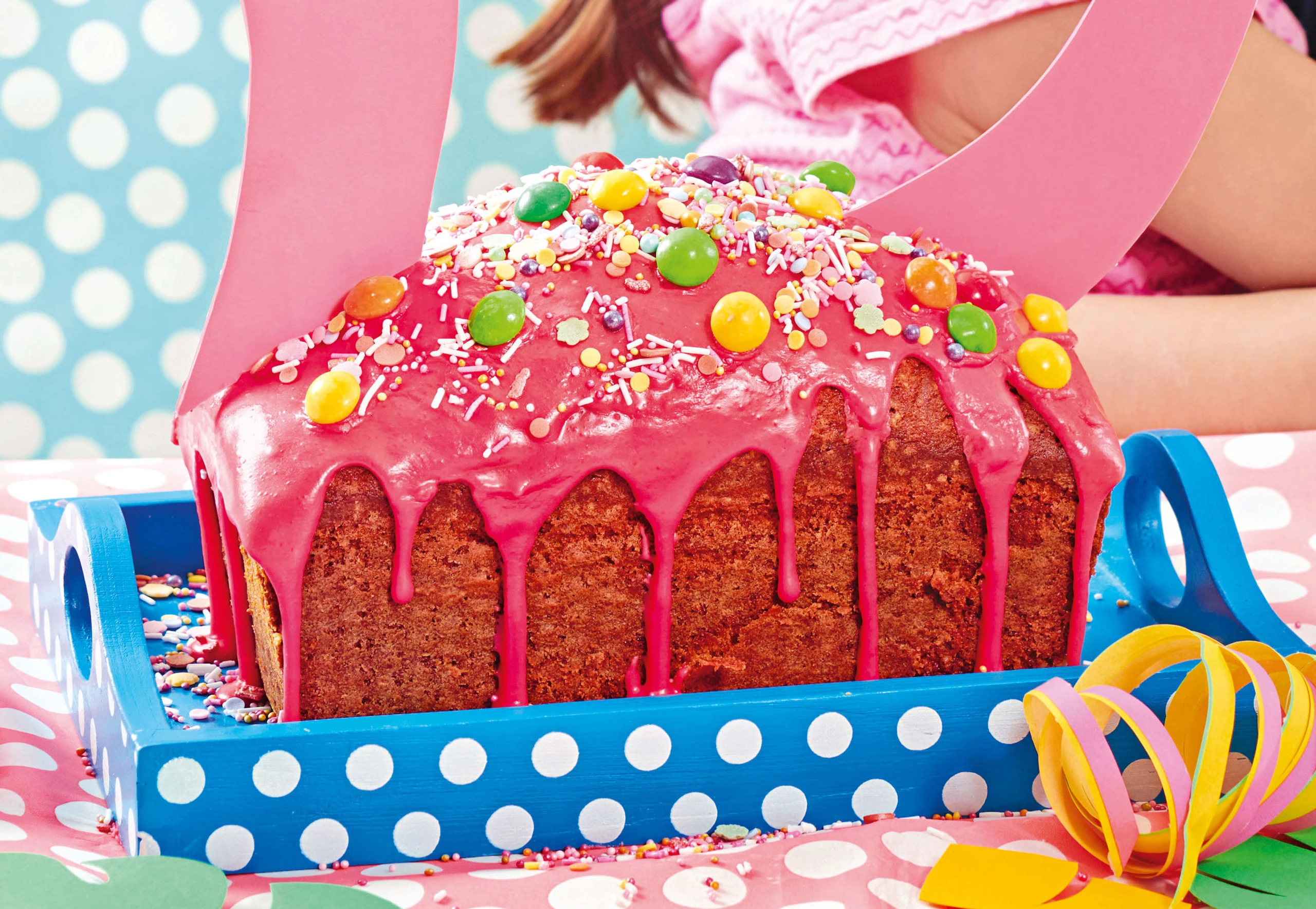 Für die Glasur Staubzucker, Zitronensaft und Lebensmittelfarbe glatt rühren. Kuchen mit der Glasur beträufeln und mit Zuckerdekor bestreuen.