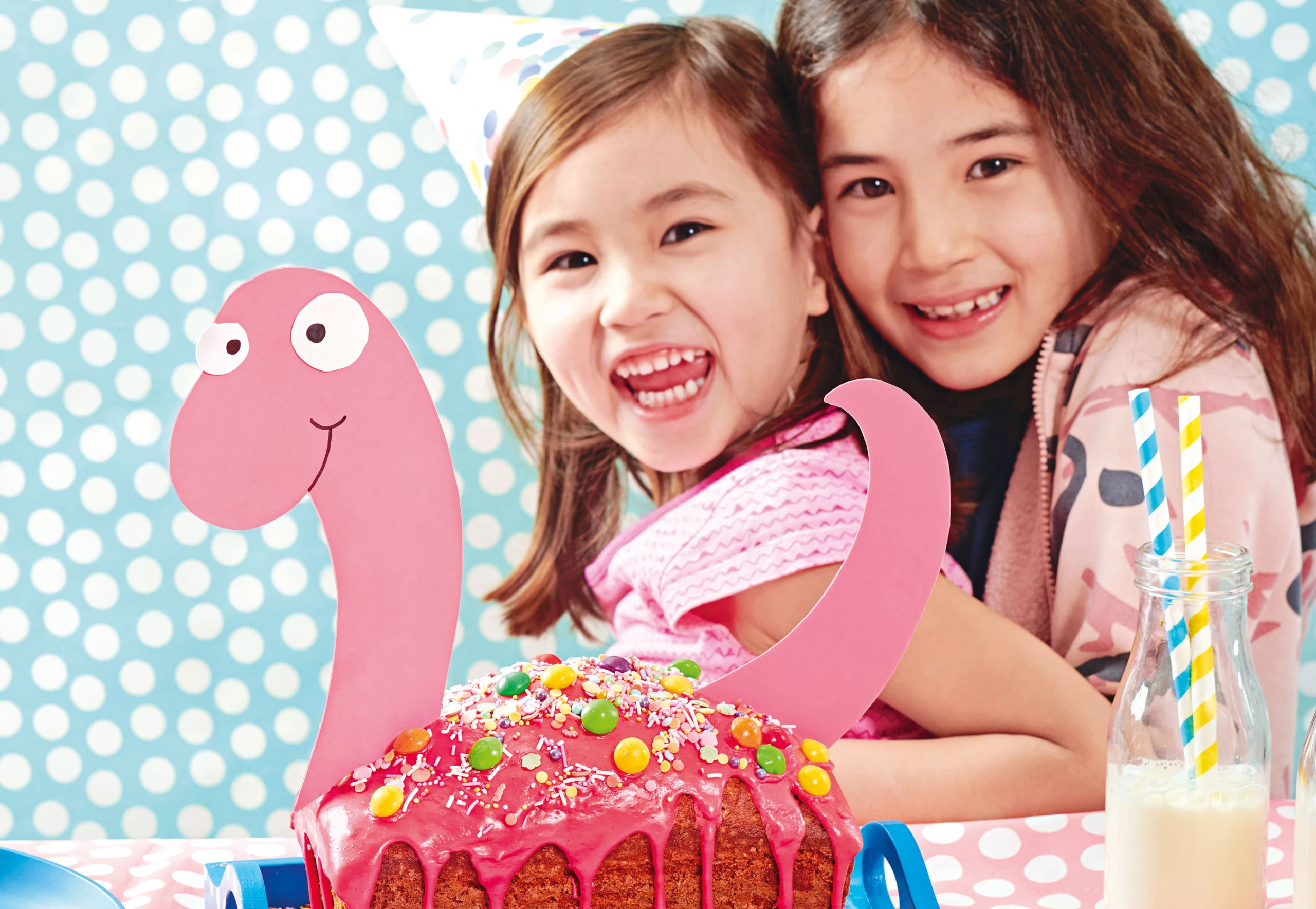 Für die Dino-Optik haben wir aus Karton „Kopf“ und „Schwanz“ geschnitten, mit Zahnstochern verstärkt und einfach in den fertigen Kuchen gesteckt.Aus dem Heft: