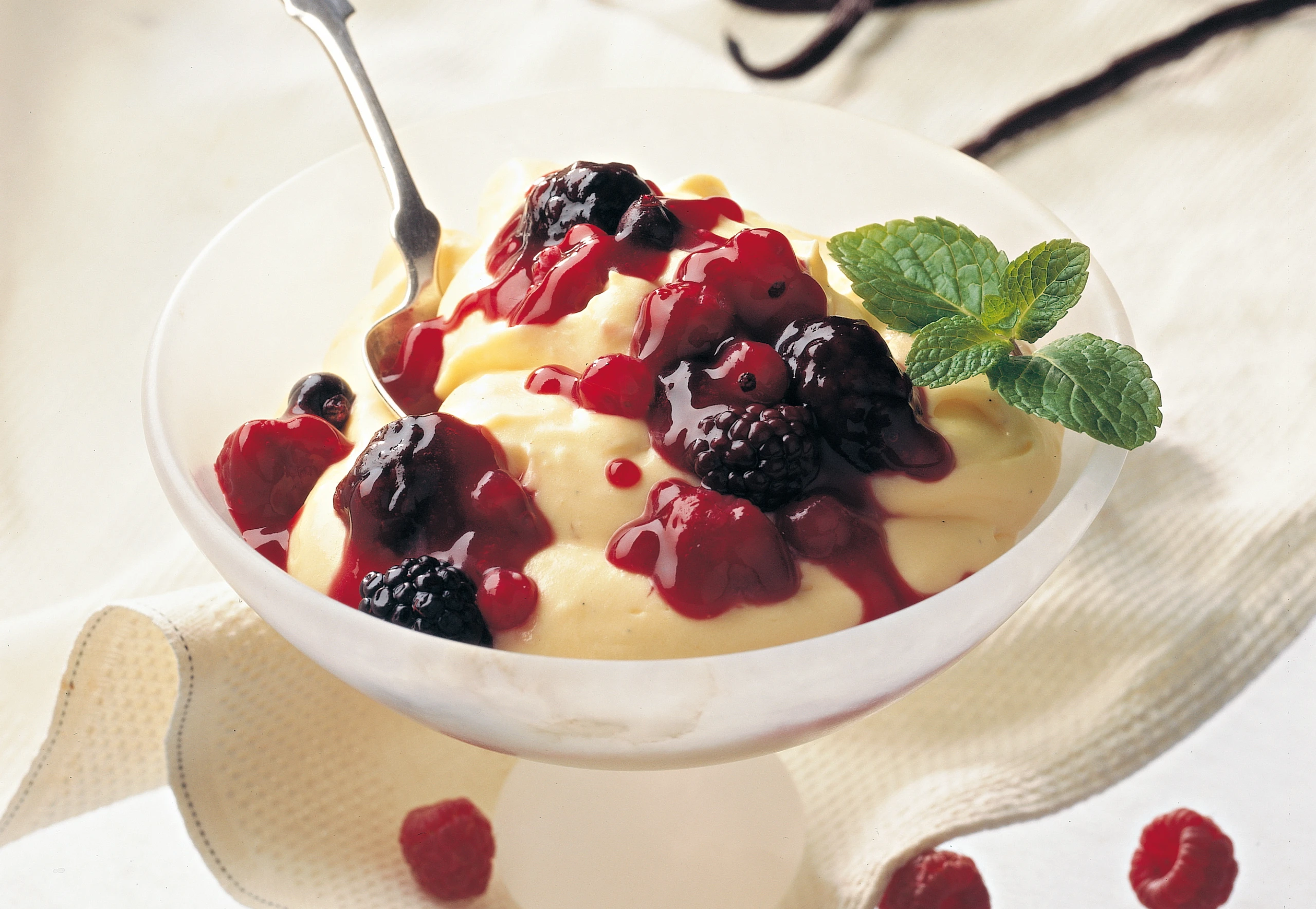 Die Creme mit dem Beerenröster anrichten und eventuell zusätzlich mit Minzeblättern garnieren.