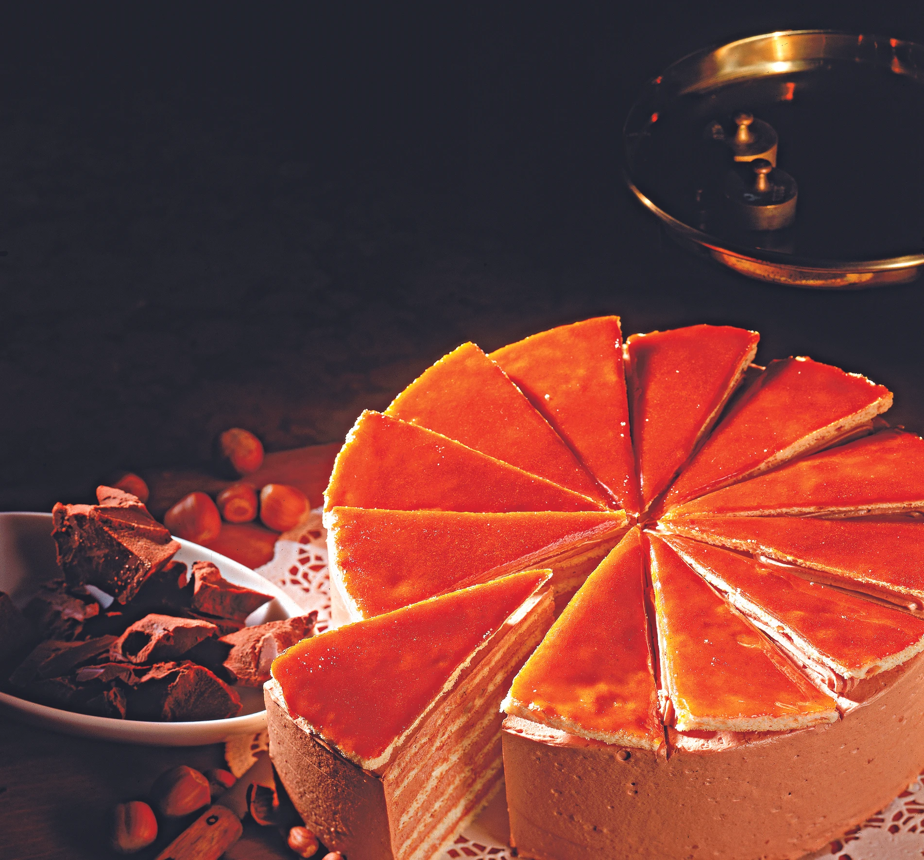 Den glasierten Boden an den markierten Stellen mit dem Messer durchschneiden. Nach jedem Schnitt das Messer erneut mit Butter bestreichen, damit der warme Karamell nicht daran kleben bleibt. Gekühlte Torte mit den glasierten Tortenstücken belegen.