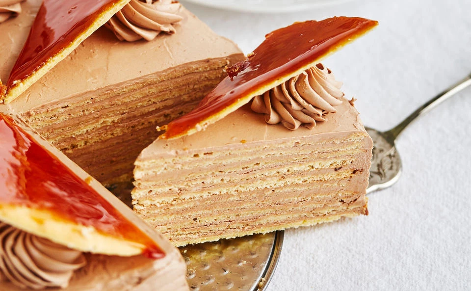 Auf 9 Tortenböden je 1 ½ EL Creme verstreichen und übereinandersetzen. Zehnten Boden darauflegen und leicht andrücken. Torte rundherum mit der übrigen Creme einstreichen und 8 Rosetten aufdressieren. Torte für mind. 5 Stunden (am besten über Nacht) kalt stellen.