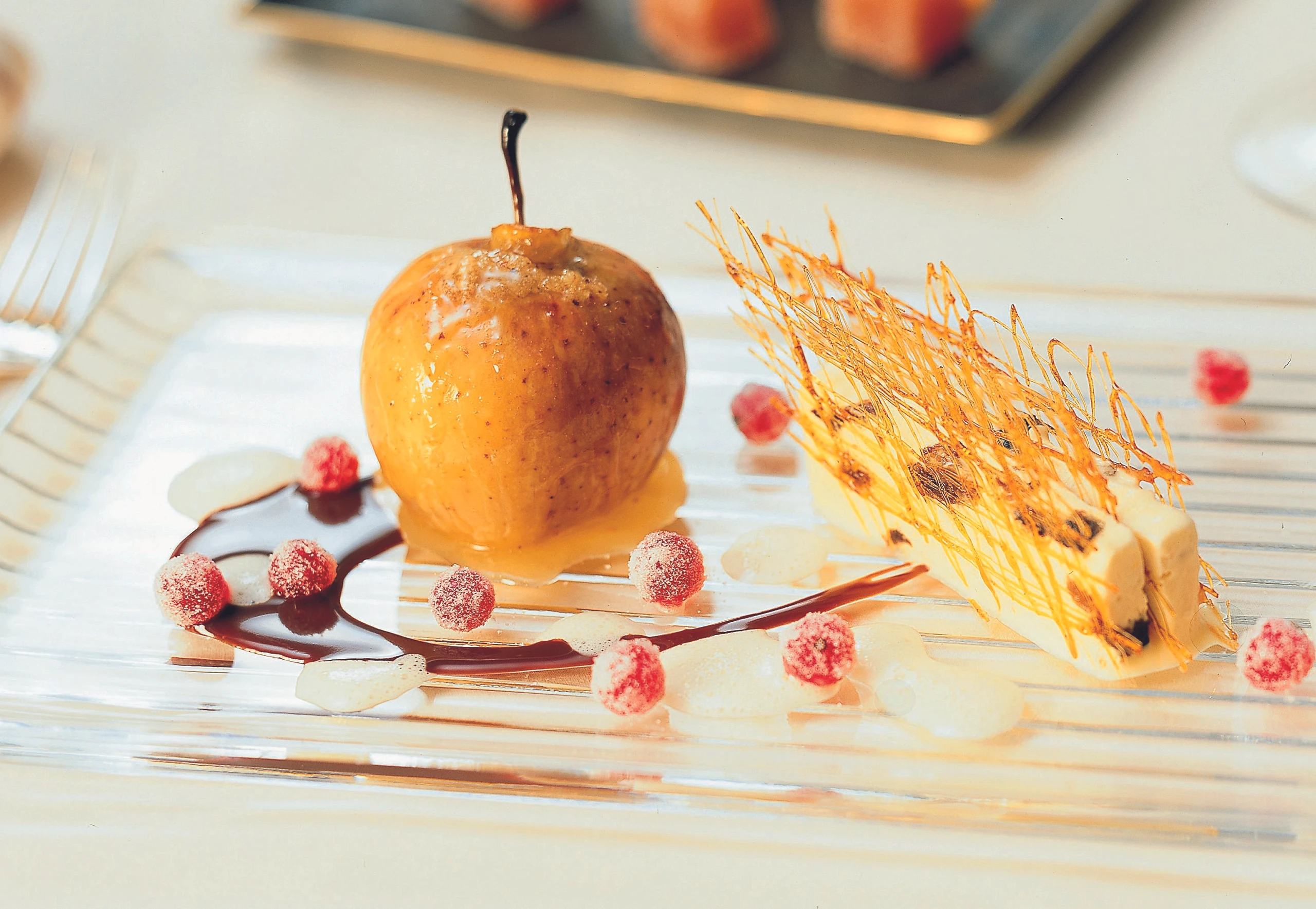 Kurz vor dem Servieren aus der Form stürzen und die Folie abziehen. Parfait in Scheiben schneiden und mit Zuckerdekor, Bratäpfeln und Sabayon servieren.