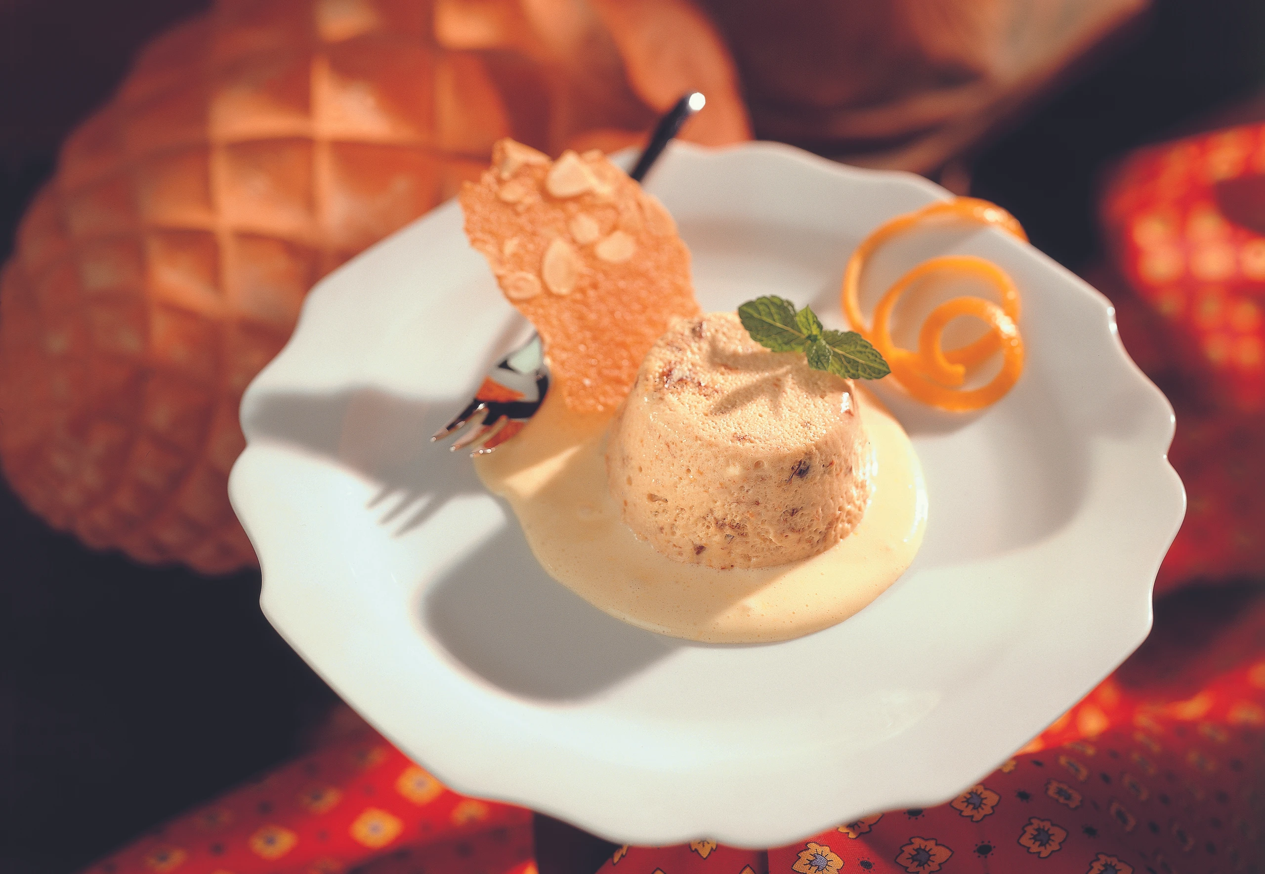 Creme aus dem Kühlschrank nehmen, die Folie entfernen. Förmchen kurz in heißes Wasser tauchen. Creme auf Teller stürzen und mit Orangen-Sabayon und Mandelblättern sowie Minzeblättern garniert servieren.