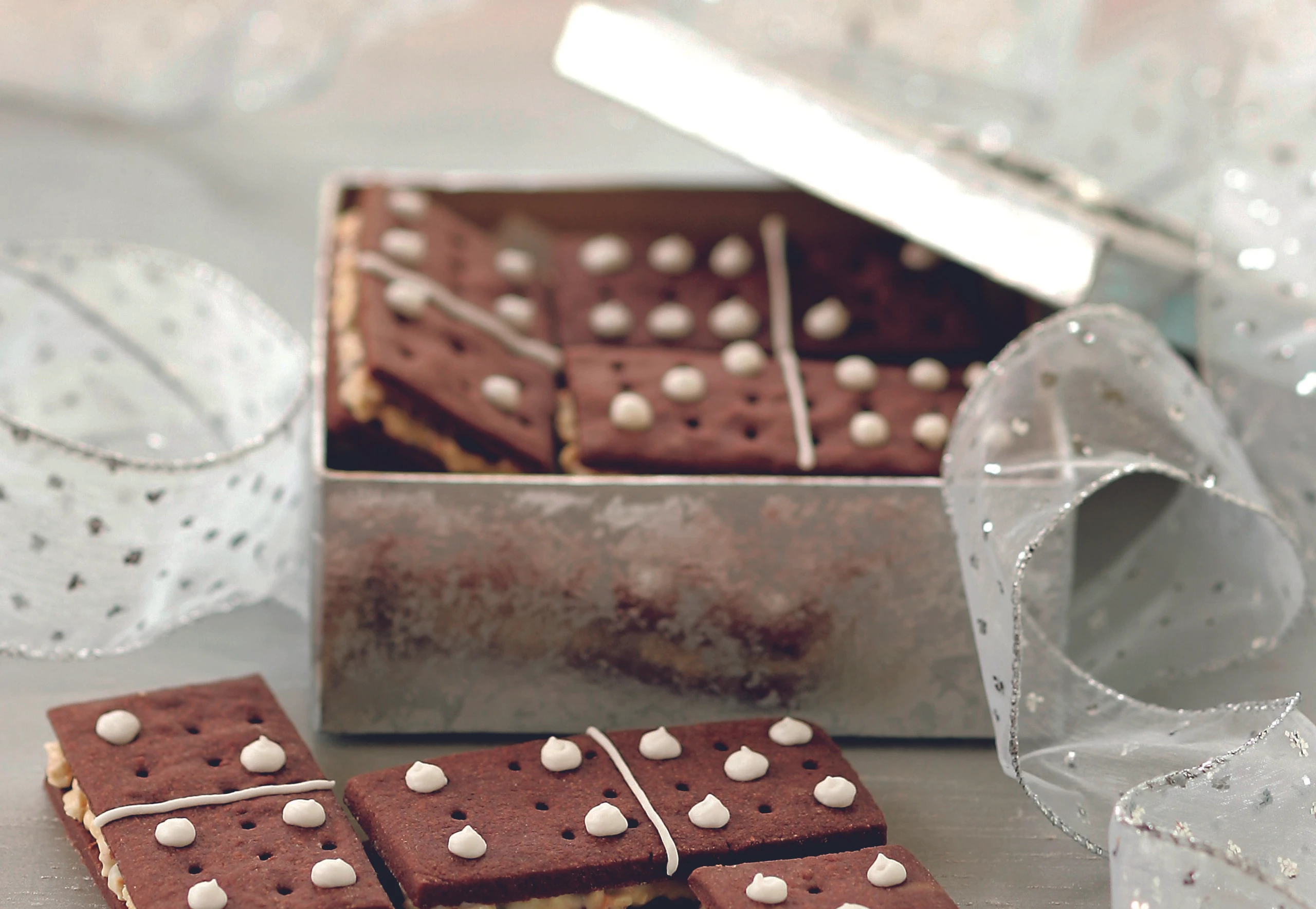 Nüsse in einer Pfanne trocken rösten, abkühlen lassen. Kuvertüre im heißen Wasserbad langsam schmelzen (das Wasser darf nicht kochen). Nüsse einrühren. Je 2 Dominosteine mit Creme zusammensetzen. Mit weißer Zuckerglasur verzieren.