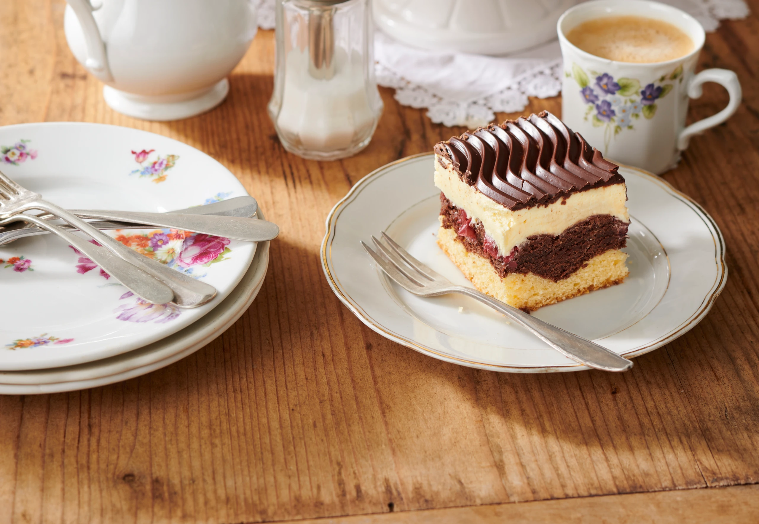 Helle Masse in der Form verstreichen. Kakaomasse darauf verstreichen. Weichseln darauf verteilen und in die Masse drücken. Kuchen im Rohr (mittlere Schiene) ca. 25 Minuten backen. Herausnehmen und auskühlen lassen.