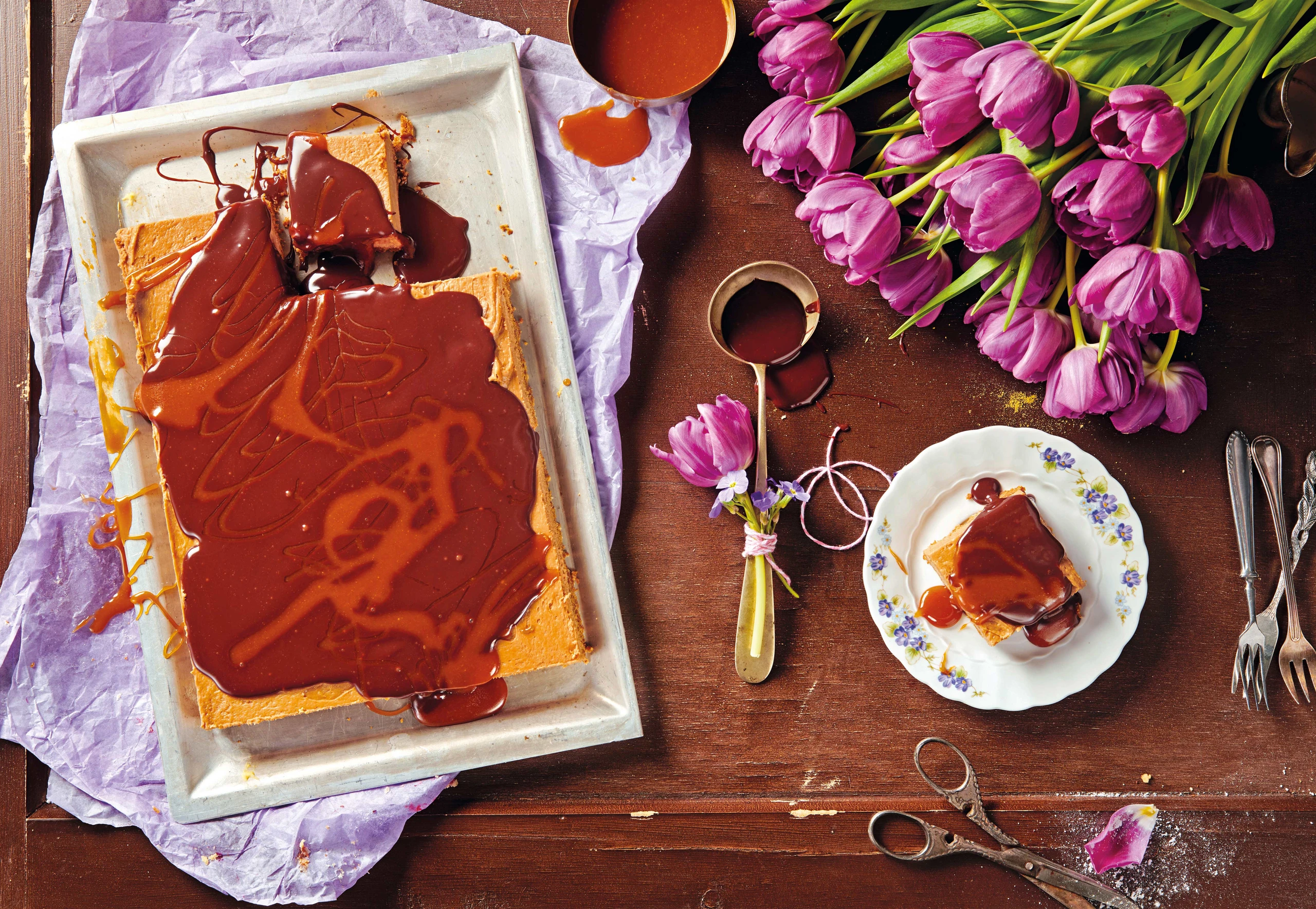 Cheesecake aus der Form lösen und auf eine Servierplatte legen. Mit Ganache bestreichen und mit Karamell beträufeln.