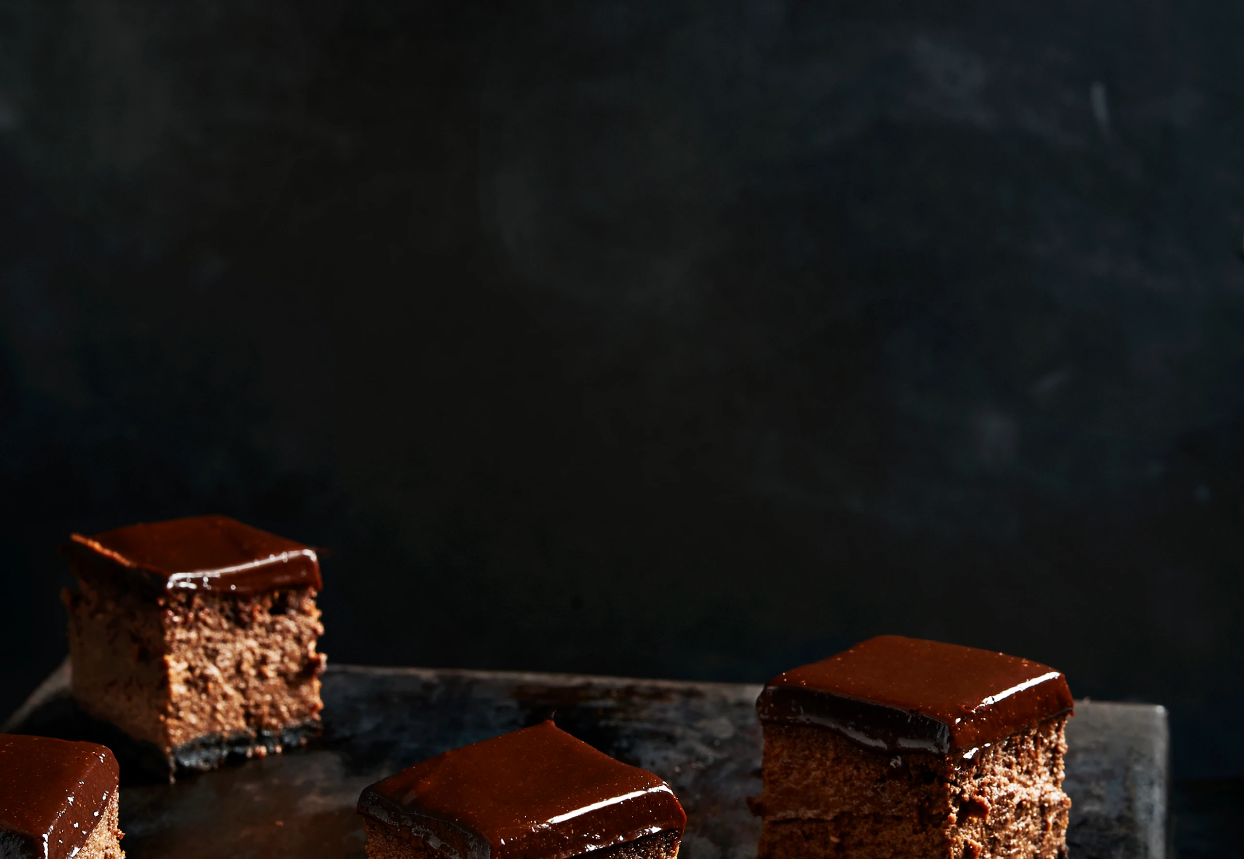 Für die Canache Obers aufkochen. Kuvertüre hacken, Obers zugeben und kurz stehen lassen. Canache mit einem Schneebesen glatt rühren und auf dem Kuchen verteilen. Im Kühlschrank fest werden lassen. Kuchen in 24 Stücke schneiden.