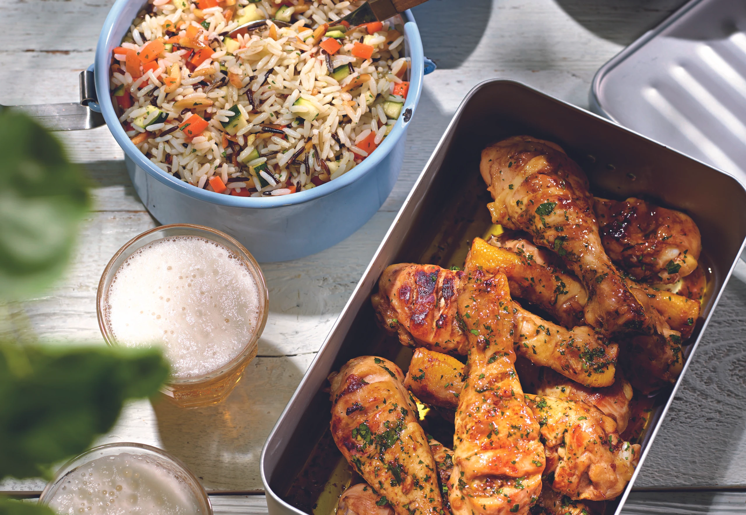 Drumsticks mit Barbecue-Marinade und Reissalat