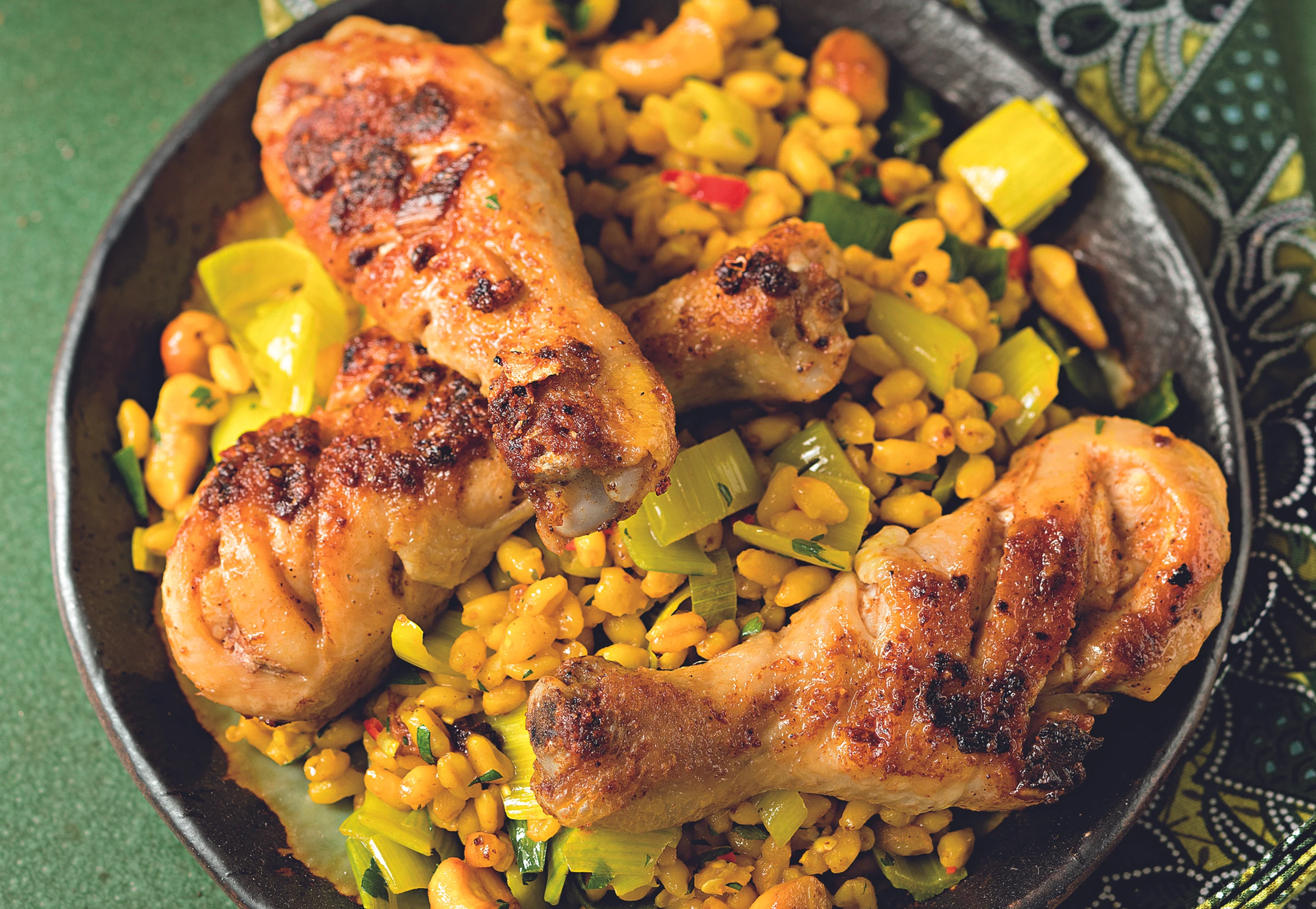 Lauch-Cashewmischung und Koriander unter den Weizen rühren. Drumsticks mit dem Weizen anrichten.