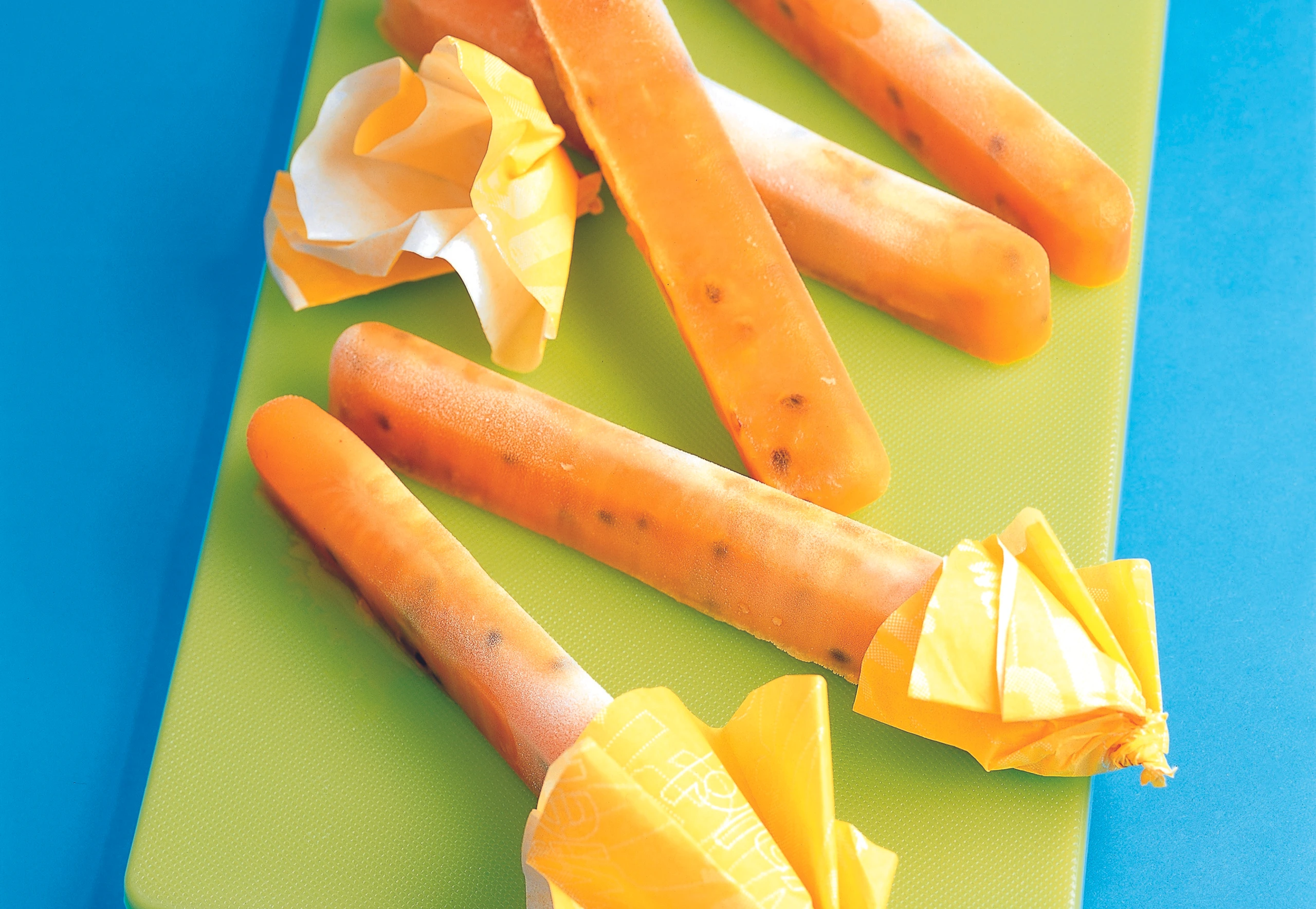Wasser mit Kristallzucker und Papayastücken aufkochen, vom Herd nehmen und mit einem Stabmixer fein pürieren. Maracuja-Fruchtmasse gut unterrühren. Mischung in die Formen füllen und ca. 10 Stunden im Tiefkühlfach gefrieren.