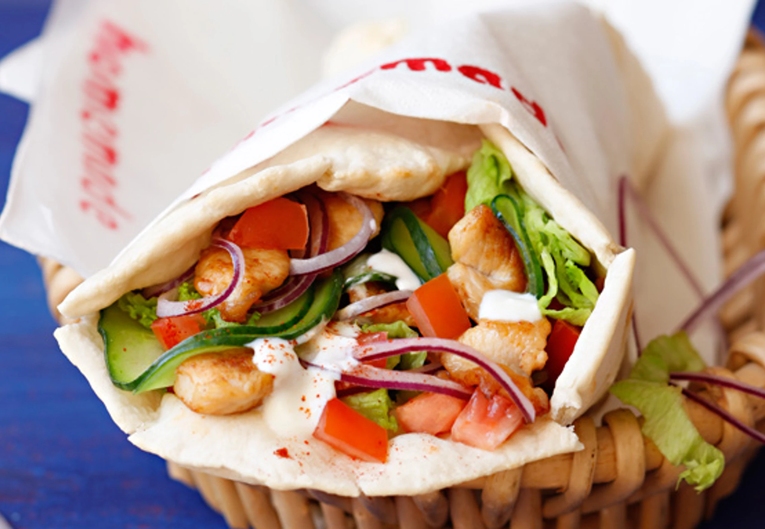 - Hühnerfleisch im Olivenöl knusprig braten. Fladen mit Joghurt bestreichen, mit Hühnerfleisch, Paradeisern, Salat, Zwiebeln und Gurken belegen, mit Salz, Pfeffer und Chilipulver würzen. Fladen einrollen und rasch servieren.