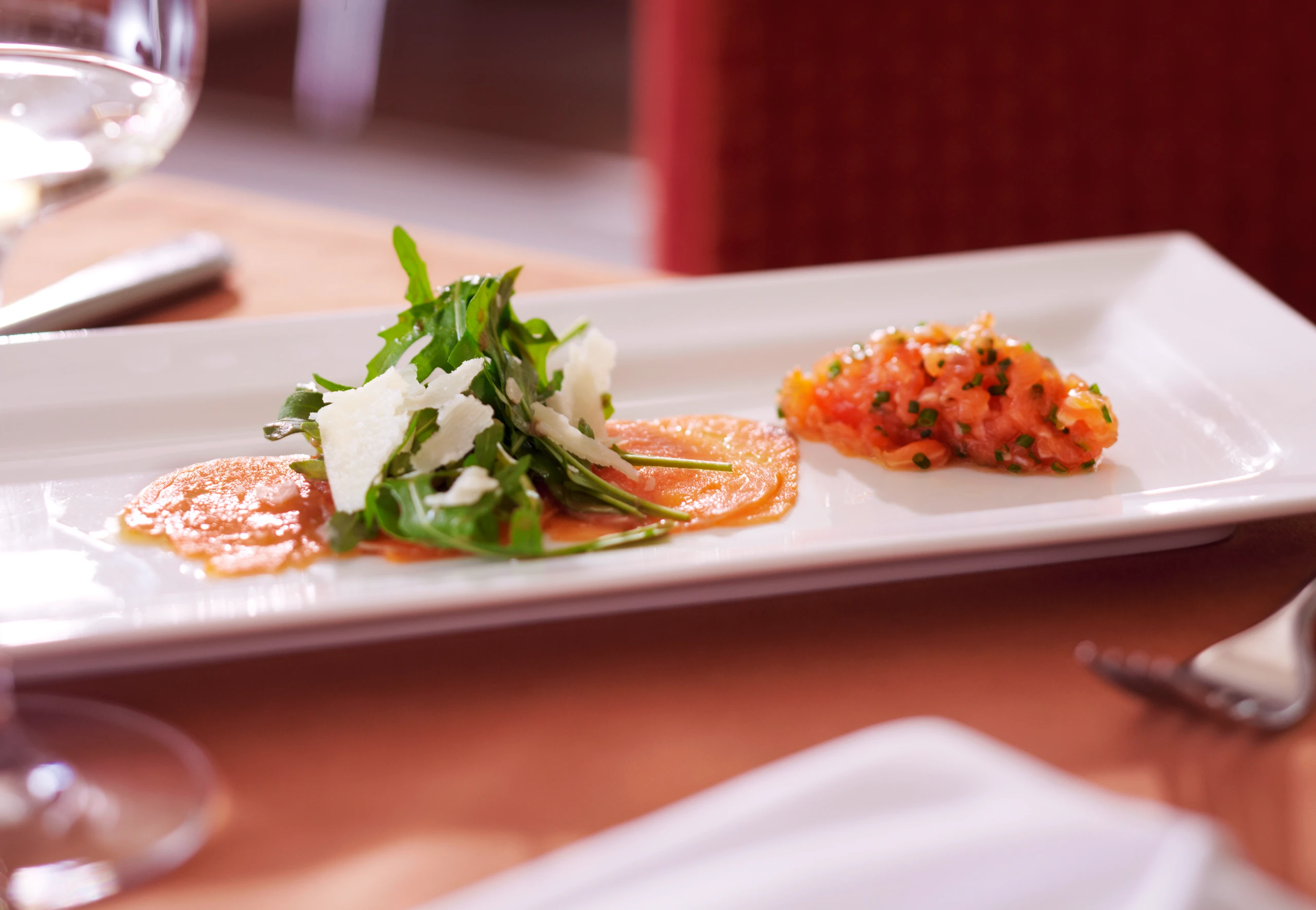 Tatar mit Hilfe eines Suppenlöffels zu Nockerl formen und auf die Teller geben. Parmesan grob hobeln. Rucola mit der Marinade vermischen. Carpaccio mit Rucola und Parmesan garnieren.