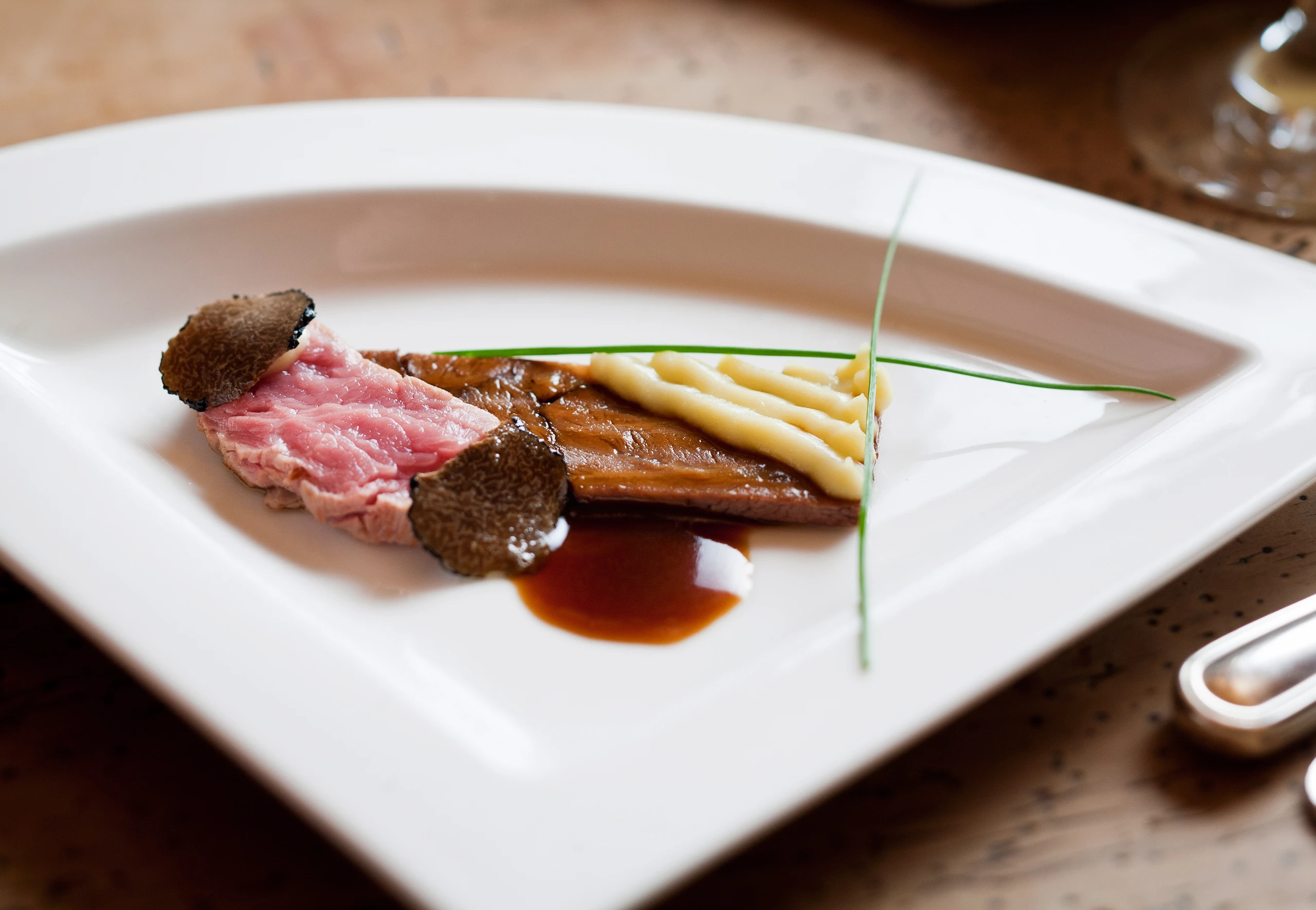 - Bratensaft erwärmen. Backerln in ca. 1 cm dicke Scheiben schneiden, auf Teller legen, mit ein wenig von der Sauce übergießen und im Rohr erwärmen. Filet in Scheiben schneiden. Selleriecreme erwärmen. Backerln mit Filet, Selleriecreme und Bratensaft anrichten. Eventuell mit Trüffel und Schnittlauch garnieren.