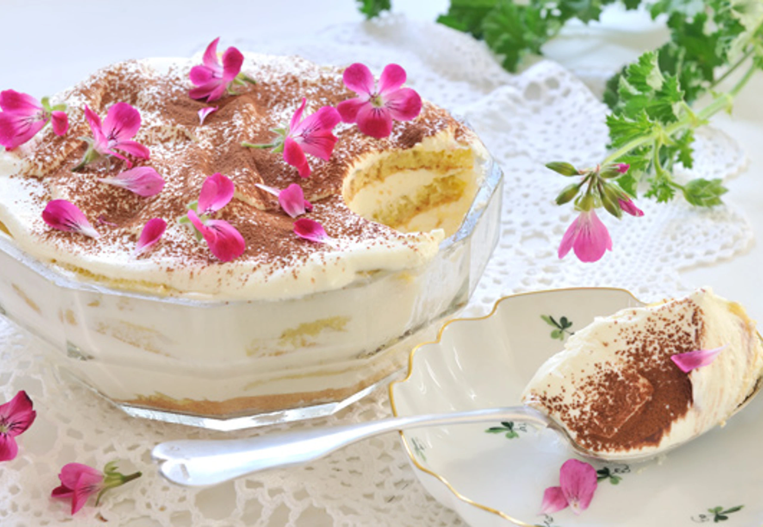 - Biskuitstücke in die Schüssel legen, mit einem Drittel vom Sirup tränken und mit einem Drittel der Creme bestreichen. Vorgang mit den Biskuitscheiben wiederholen. Tiramisu zugedeckt für 3 Stunden kühl stellen. Vor dem Servieren mit Kakao bestreuen und mit den Blüten garnieren.