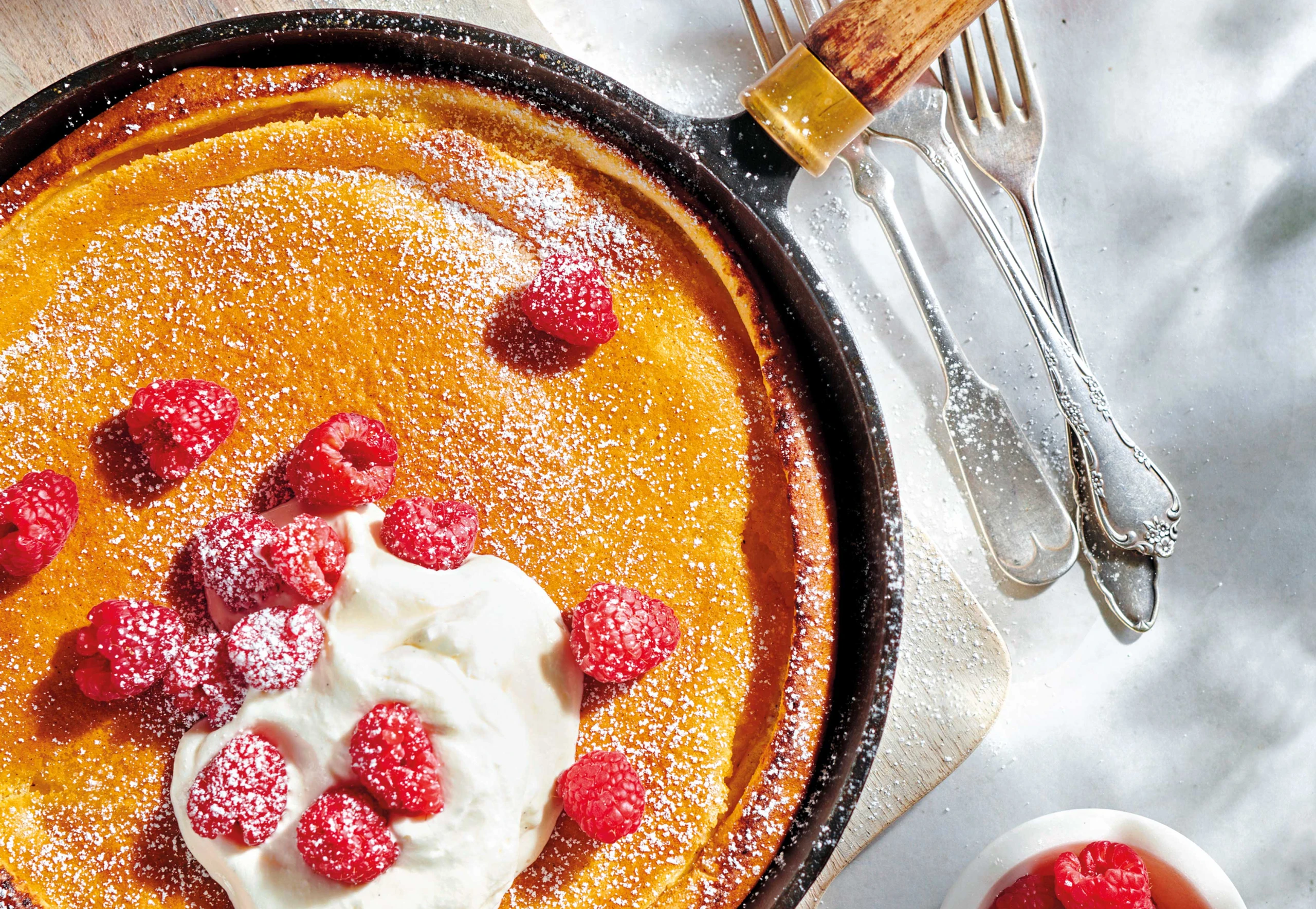 Dutch Baby herausnehmen und mit Himbeeren und Obers garnieren. Mit Staubzucker bestreut servieren.