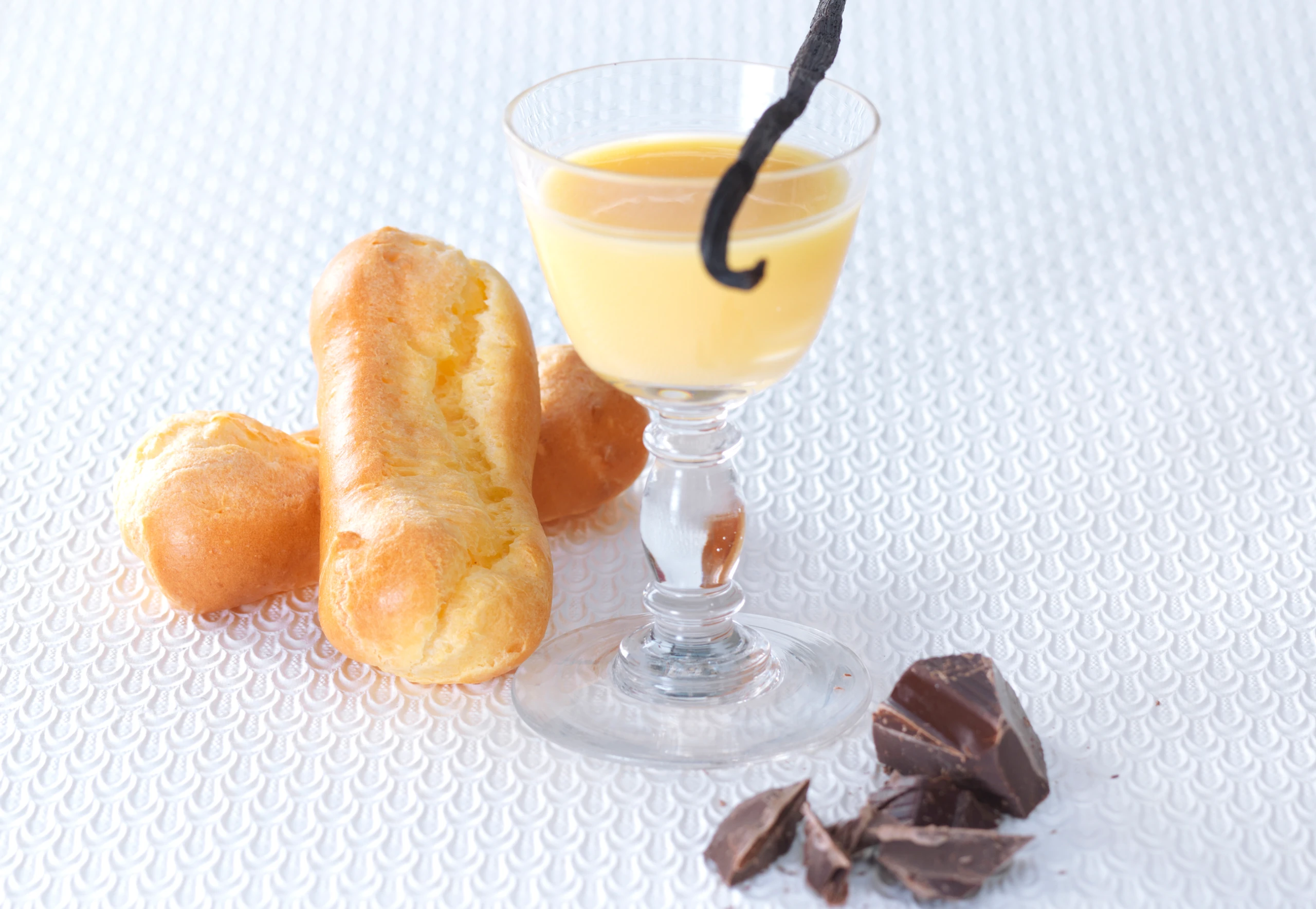 Creme in einen Dressiersack füllen. Eclairs längs durchschneiden. Creme auf die Böden dressieren, Deckel darauf setzen und die Eclairs mit Kuvertüre verzieren.