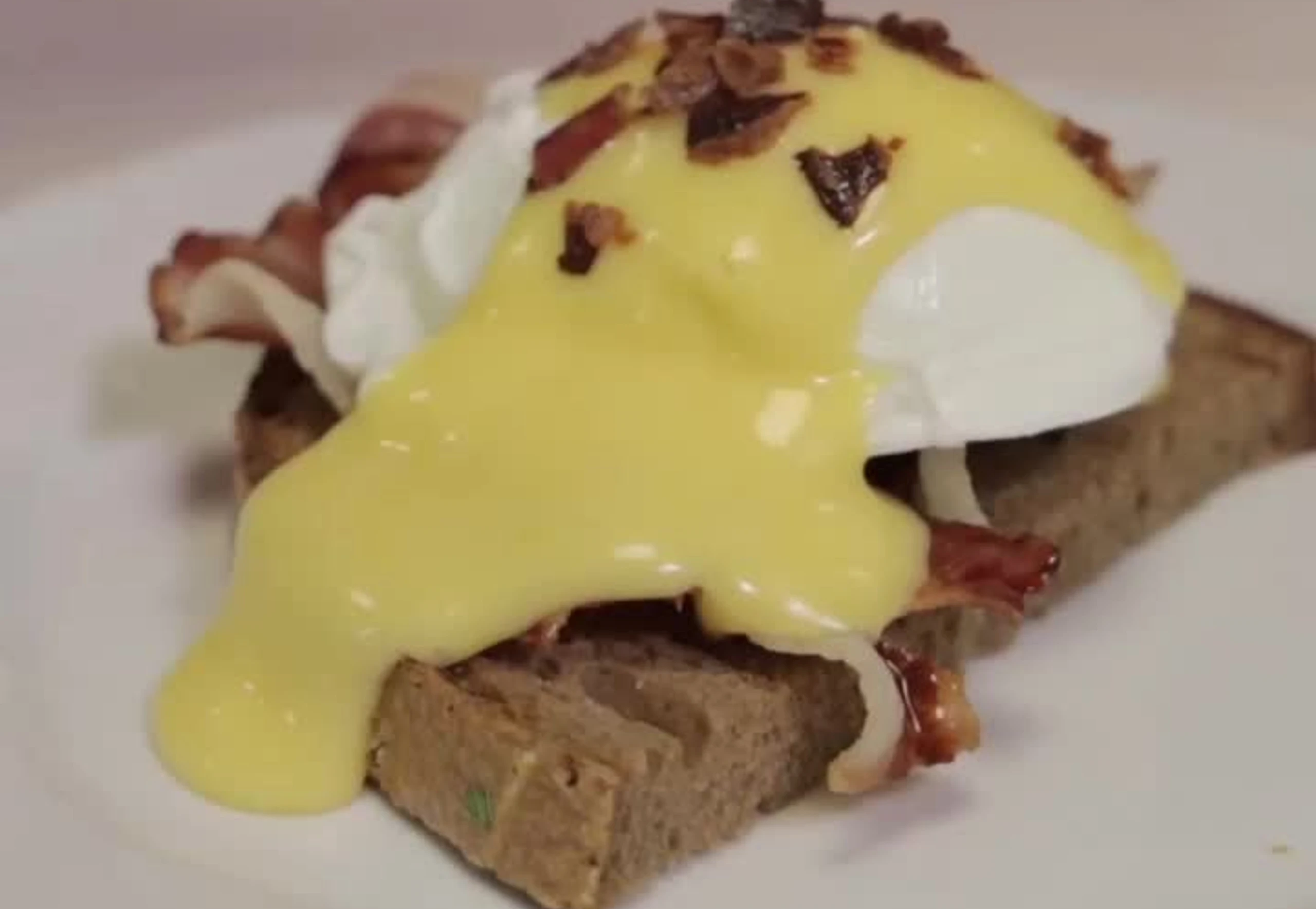 Pochierte Eier mit Brot, Speck und Sauce Hollandaise anrichten. Mit Schnittlauch bestreuen.