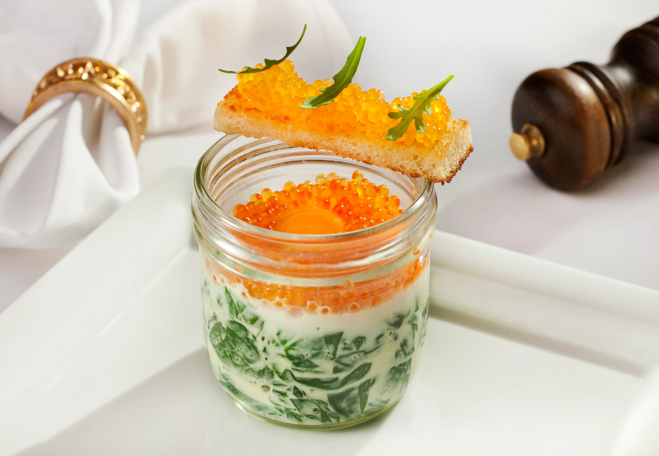 Ei im Glas mit Bärlauchspinat und Kaviar