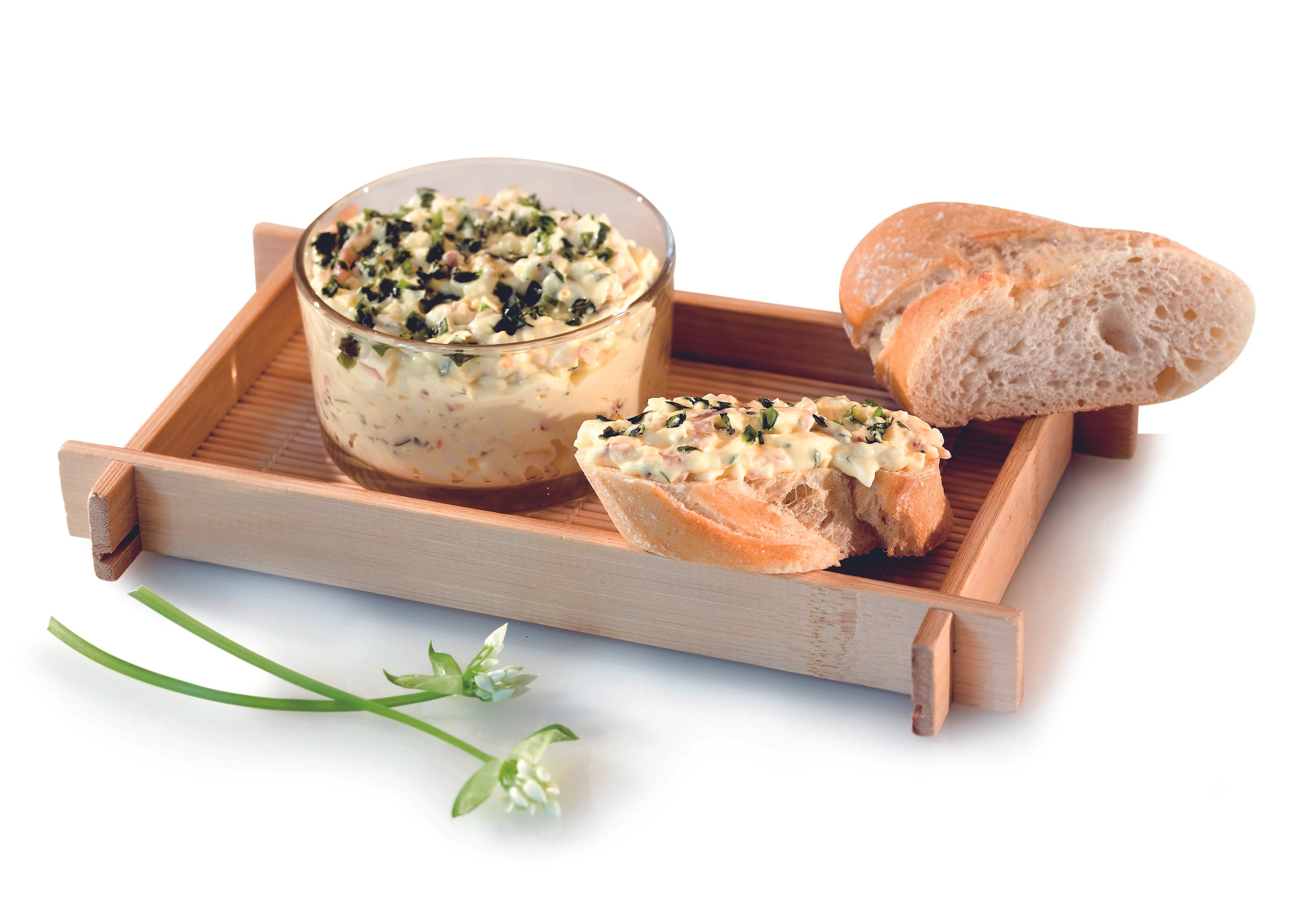 Topfen mit Mayonnaise und Joghurt glatt rühren. Eier, Speck und Bärlauch untermengen, mit Salz und Pfeffer würzen. Mit Brot servieren.