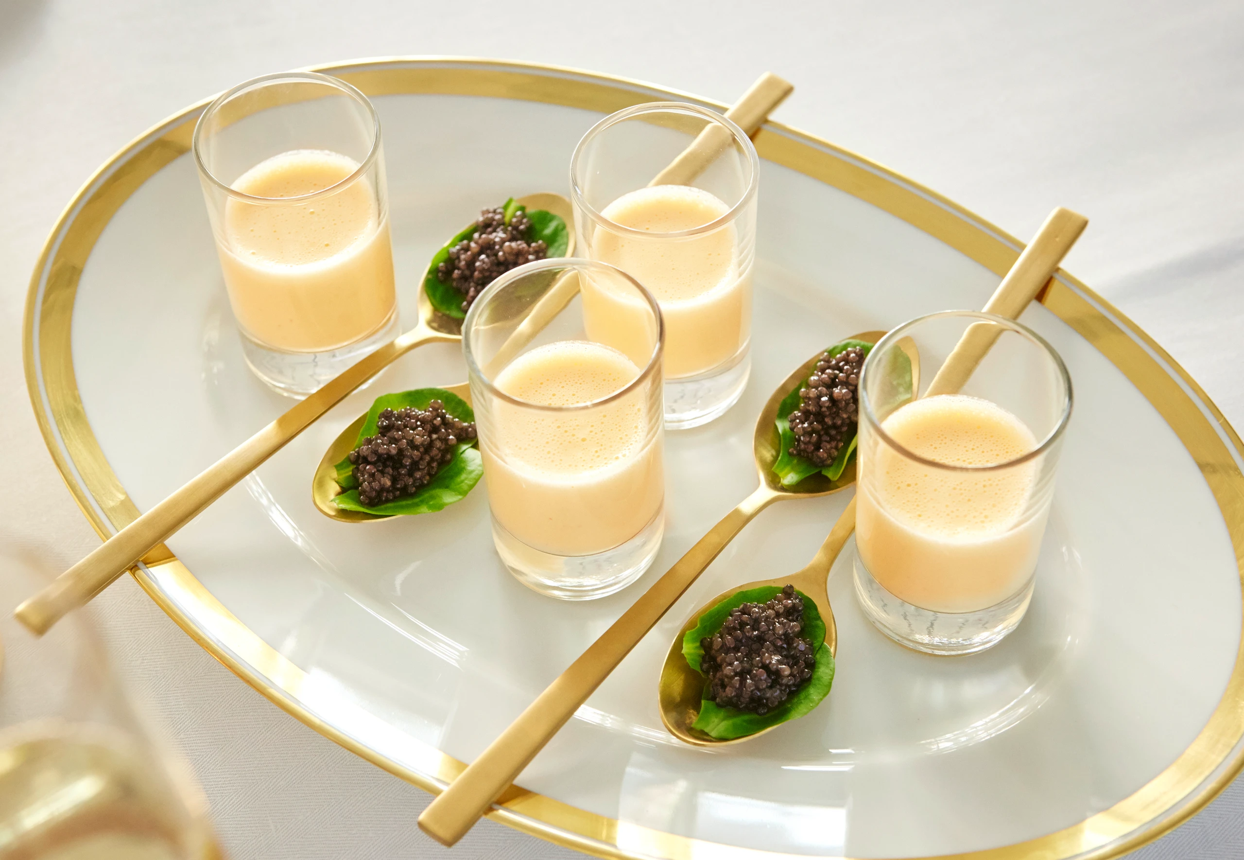 Für die Garnitur Löffel mit Vogerlsalat belegen, darauf den Kaviar verteilen. Löffel kühl stellen.