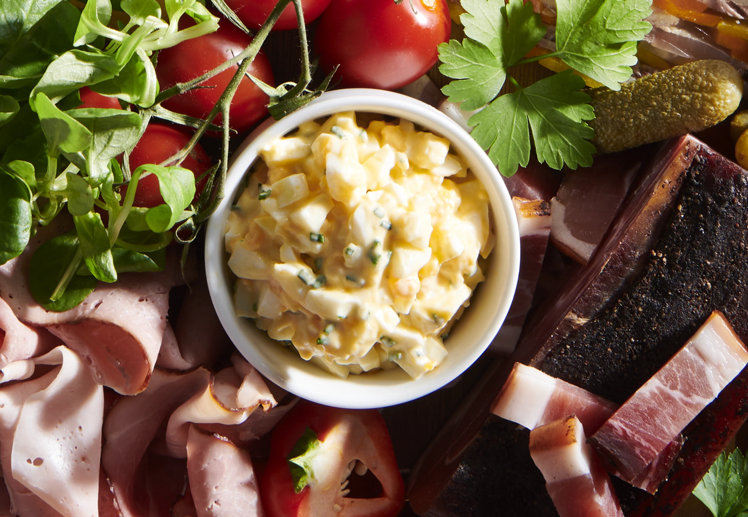 Eier 10 Minuten kochen, abschrecken und auskühlen lassen. Eier schälen, fein würfeln und mit den übrigen Zutaten vermischen. Mit Salz und Pfeffer abschmecken.