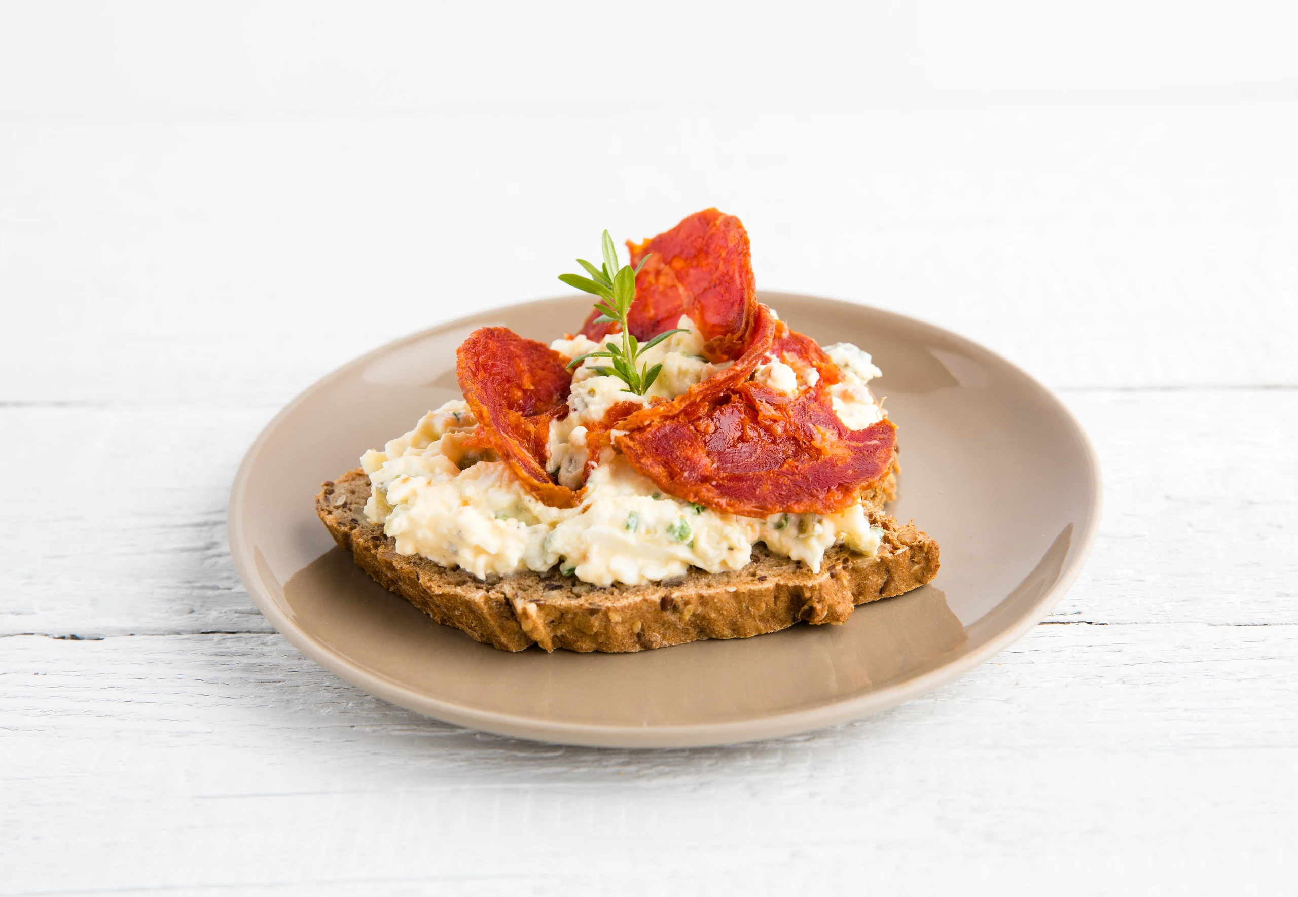 - Butter mit dem Schneebesen cremig rühren, Topfen, Joghurt, Eier, Gurken und Schnittlauch einrühren. Aufstrich mit Salz, Pfeffer und Muskat würzen und mit Chorizo garnieren.