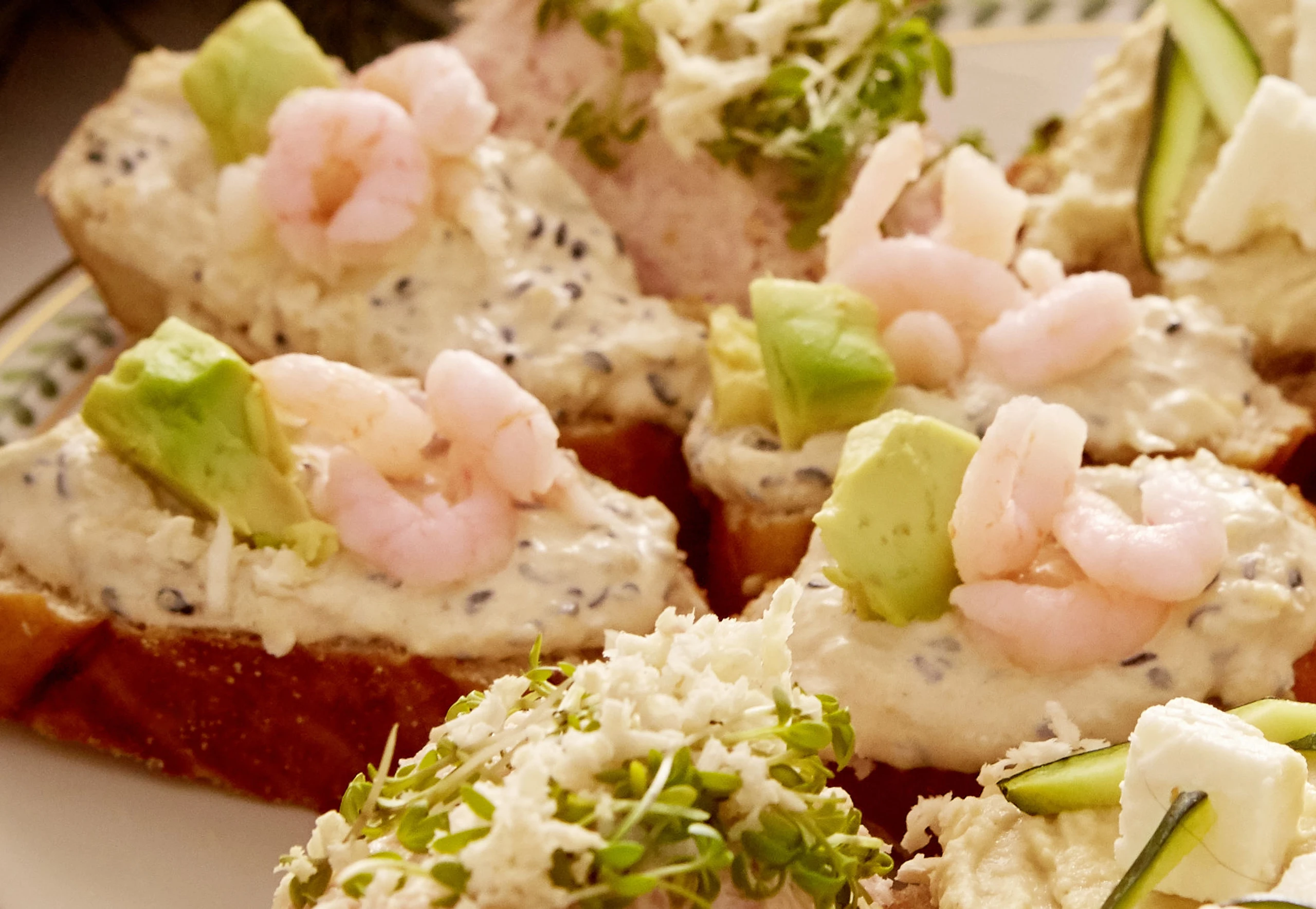 Brotscheiben mit dem Aufstrich bestreichen und mit Avocadostücken und Shrimps garnieren.