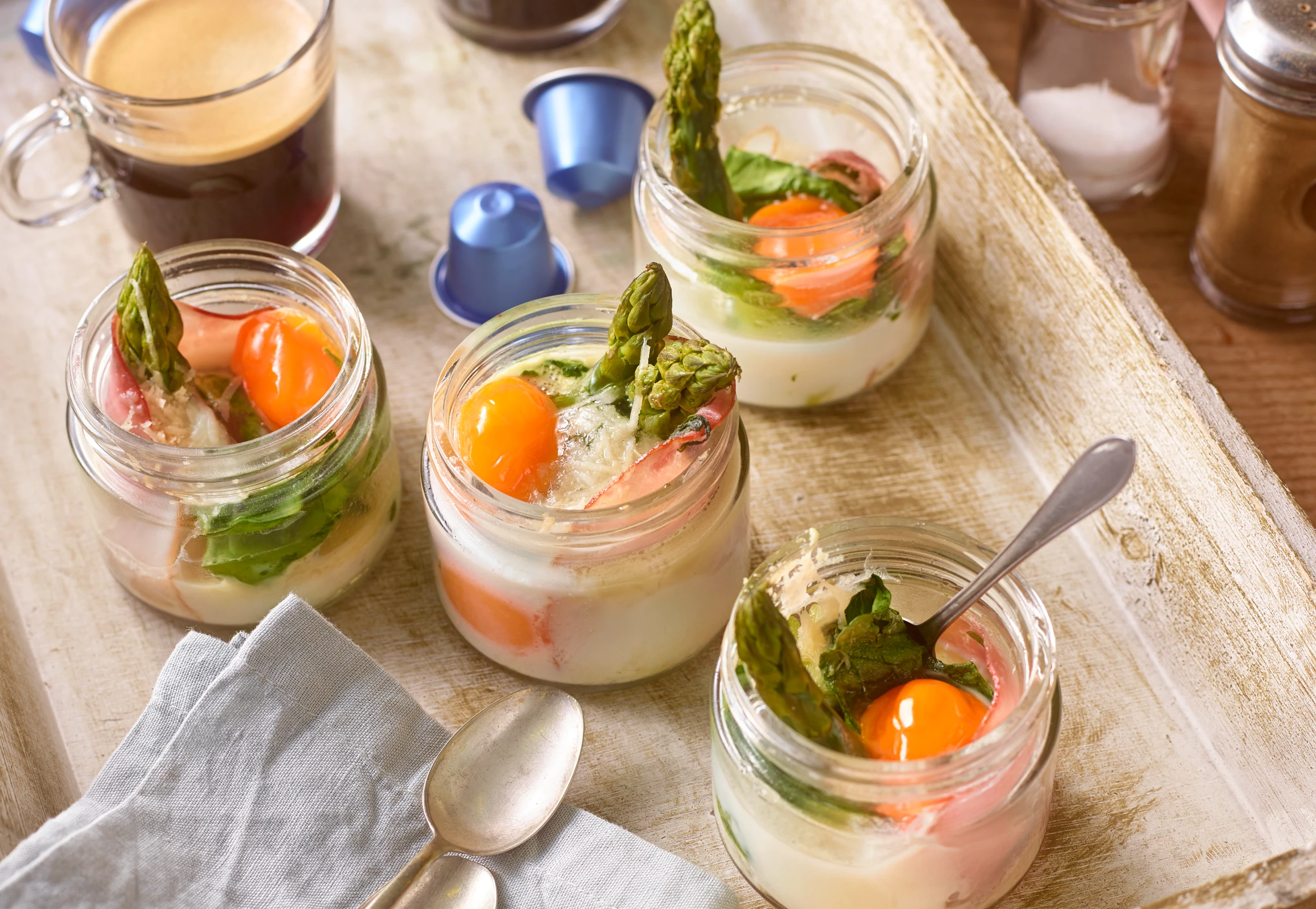Spinat und Schinken in den Gläsern verteilen. Etwas Muskat darüber reiben. Spargel in Stücke schneiden und mit dem Spinat in den Gläsern verteilen. Spargelspitzen aufrecht in die Gläser stellen. Eier vorsichtig hineinschlagen. Pro Glas 2 EL Obers dazu geben. Mit Salz und Pfeffer würzen. Parmesan darüber streuen. Mit Olivenöl beträufeln.
