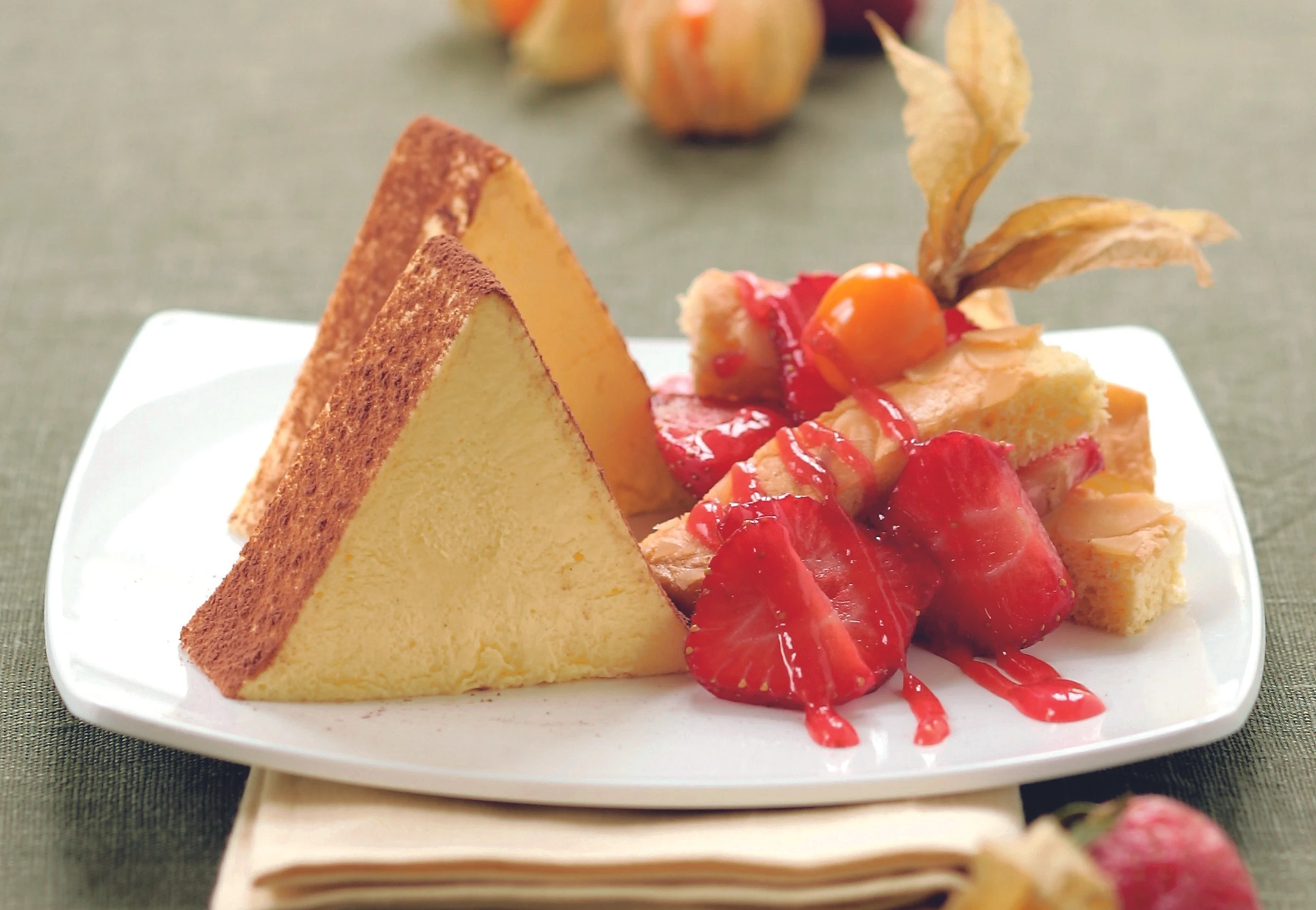 Parfait aus der Form stürzen, mit Kakao bestreuen, in Scheiben schneiden und mit Biskuitstücken garnieren.
