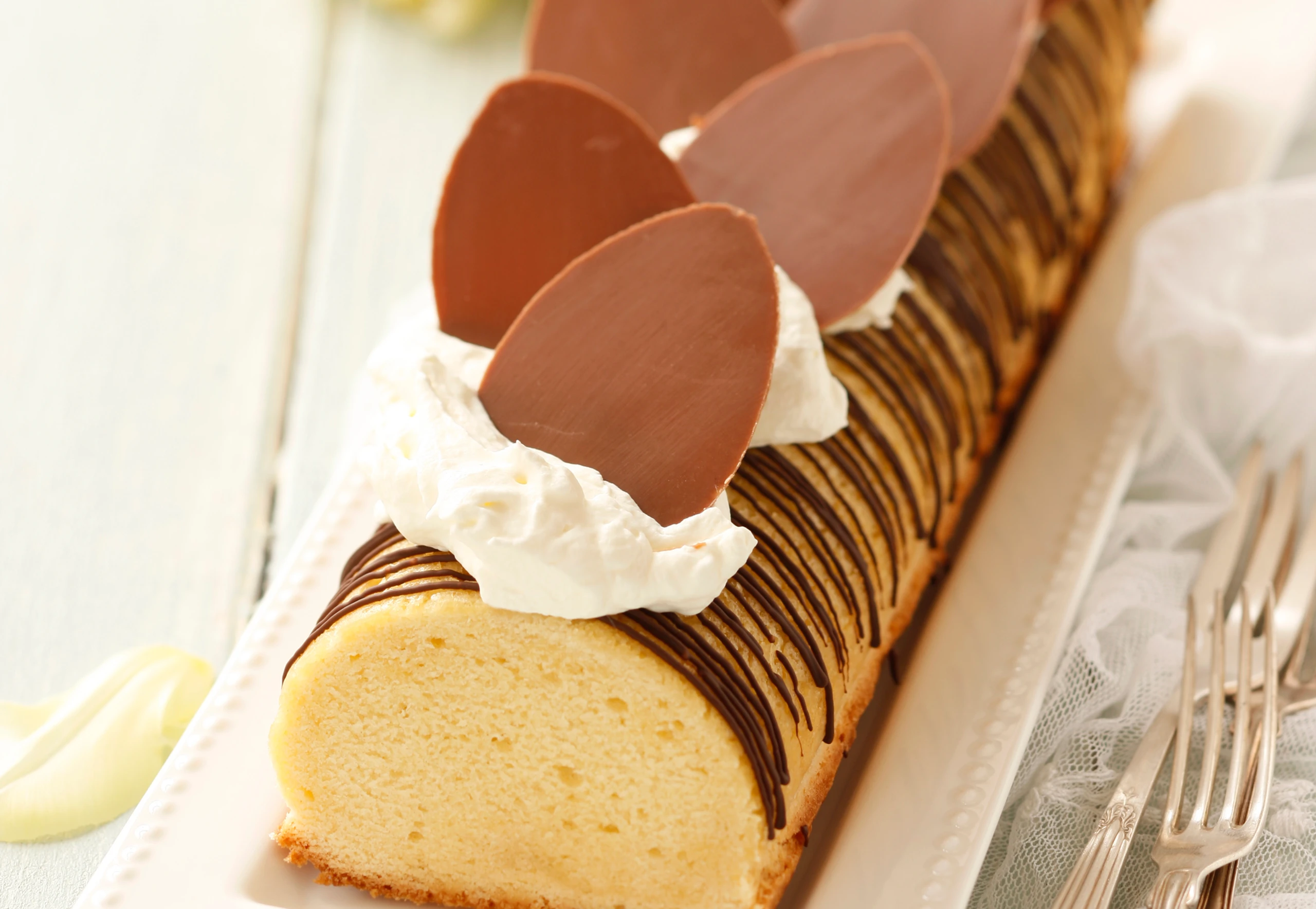 Für die Garnitur Milchschokolade hacken, im Wasserbad schmelzen, auf ein Stück Backpapier streichen und im Kühlschrank fest werden lassen. Eiförmige Plätzchen ausstechen.