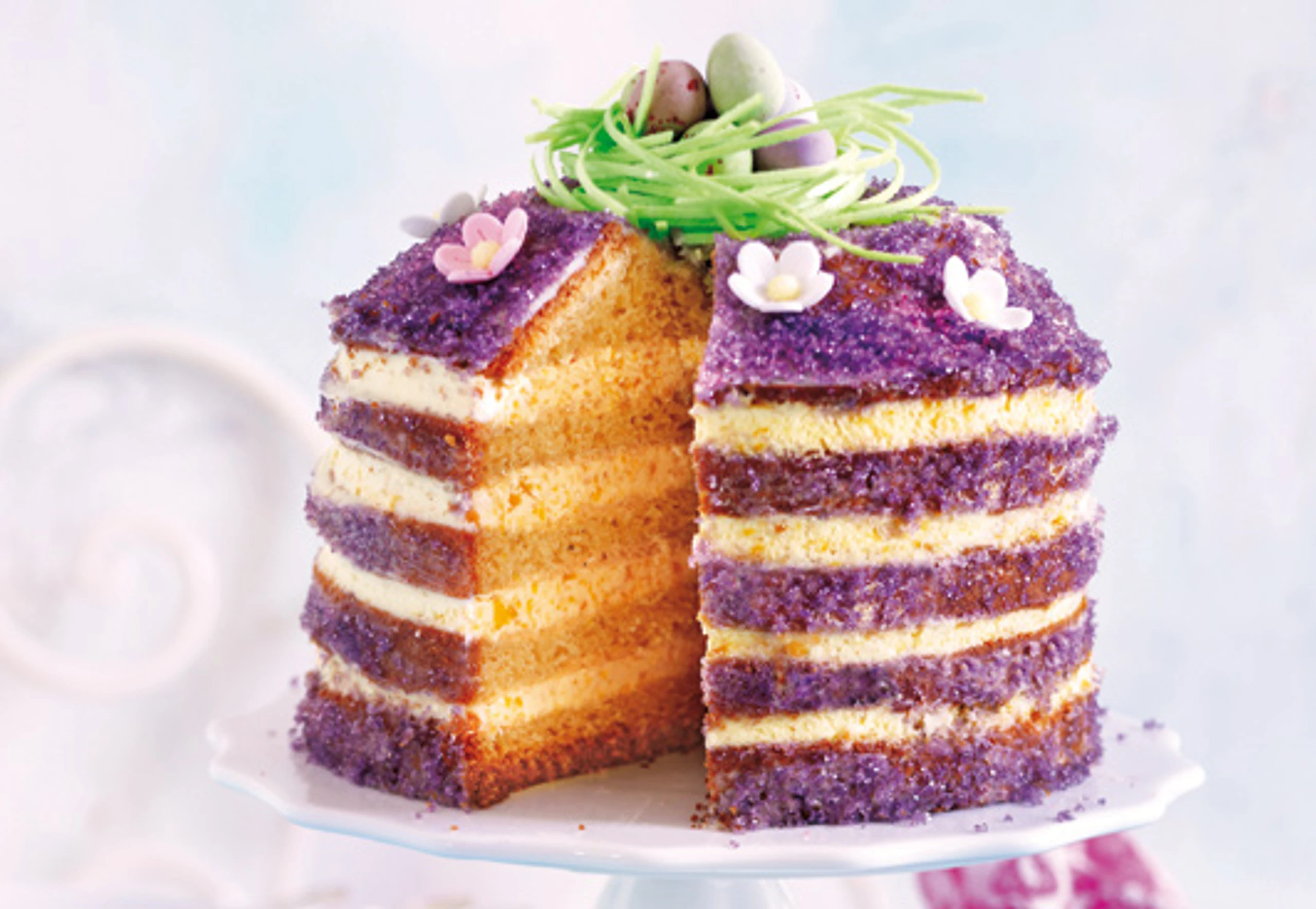 - Kuchen vier Mal durchschneiden. Böden mit Creme bestreichen und zusammensetzen. Torte rundum mit Frosting einstreichen, mit Zucker bestreuen, mit Blüten, Ostergras und Dragee-Eiern garnieren.