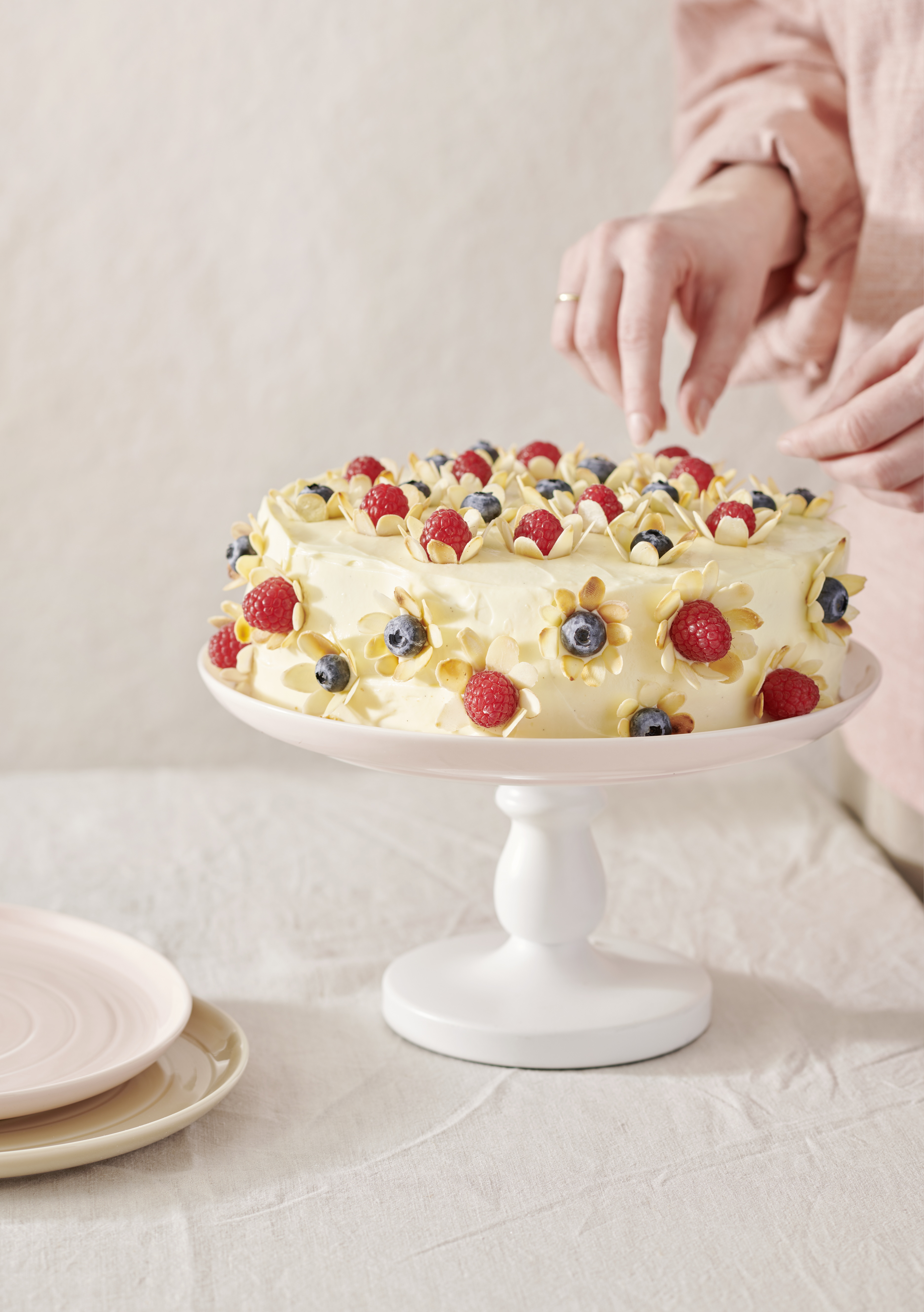 Für die Deko Mandelblättchen in einer trockenen Pfanne goldbraun rösten und auskühlen lassen. Torte mit Beeren und Mandelblättchen verzieren.