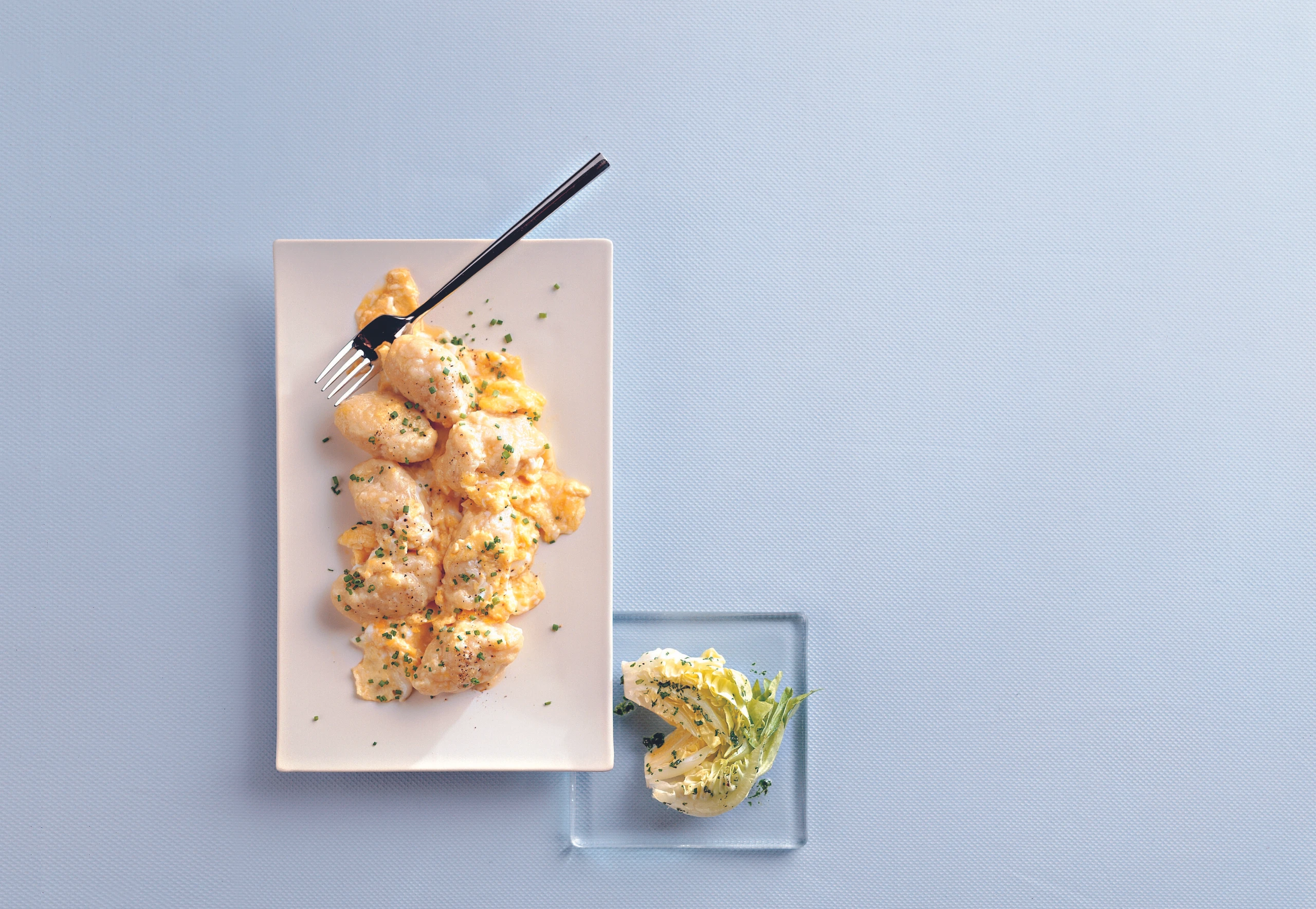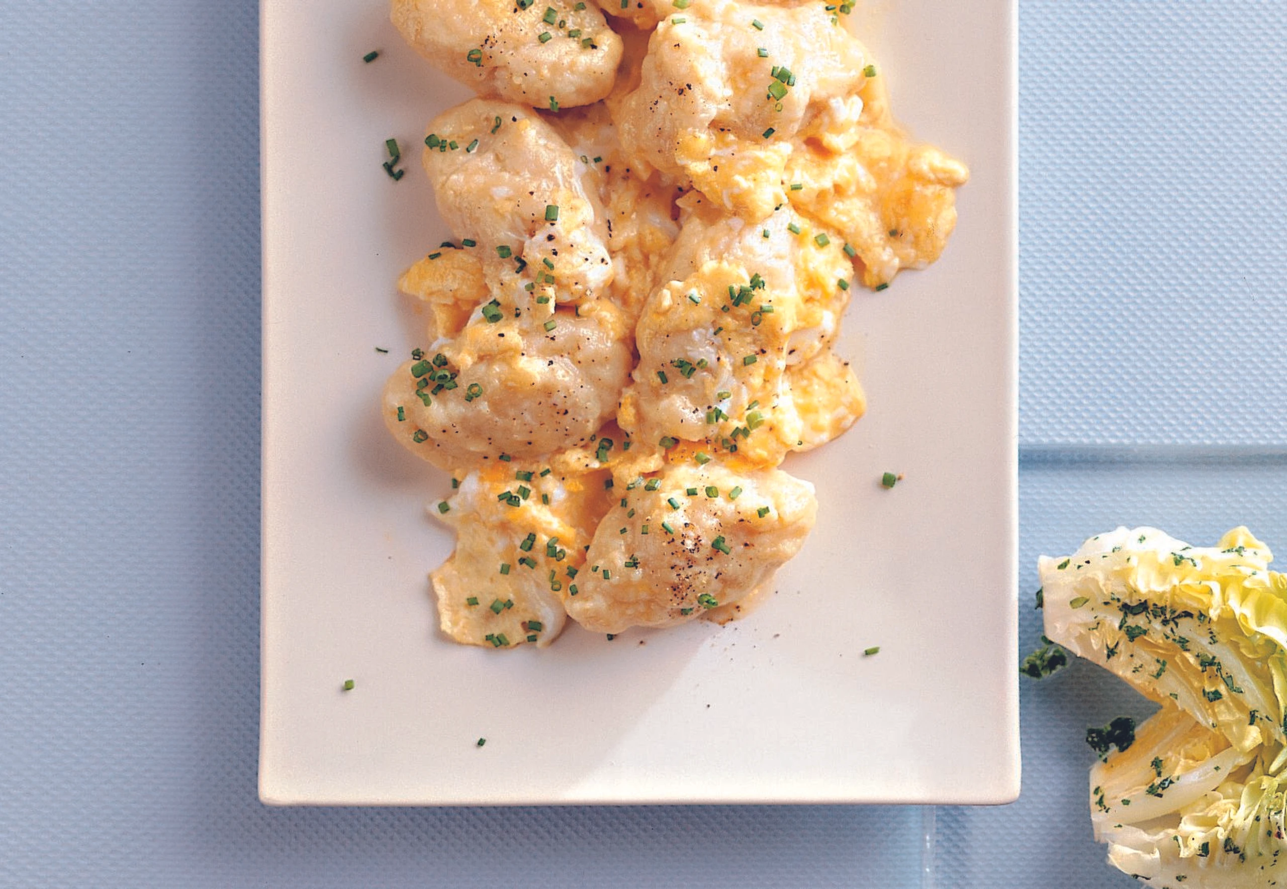 Butter aufschäumen, Nockerl darin kurz schwenken. Eimischung darüber gießen und anziehen lassen, bis sie cremig fest geworden ist. Nockerl mit Schnittlauch bestreuen und mit Salat servieren.