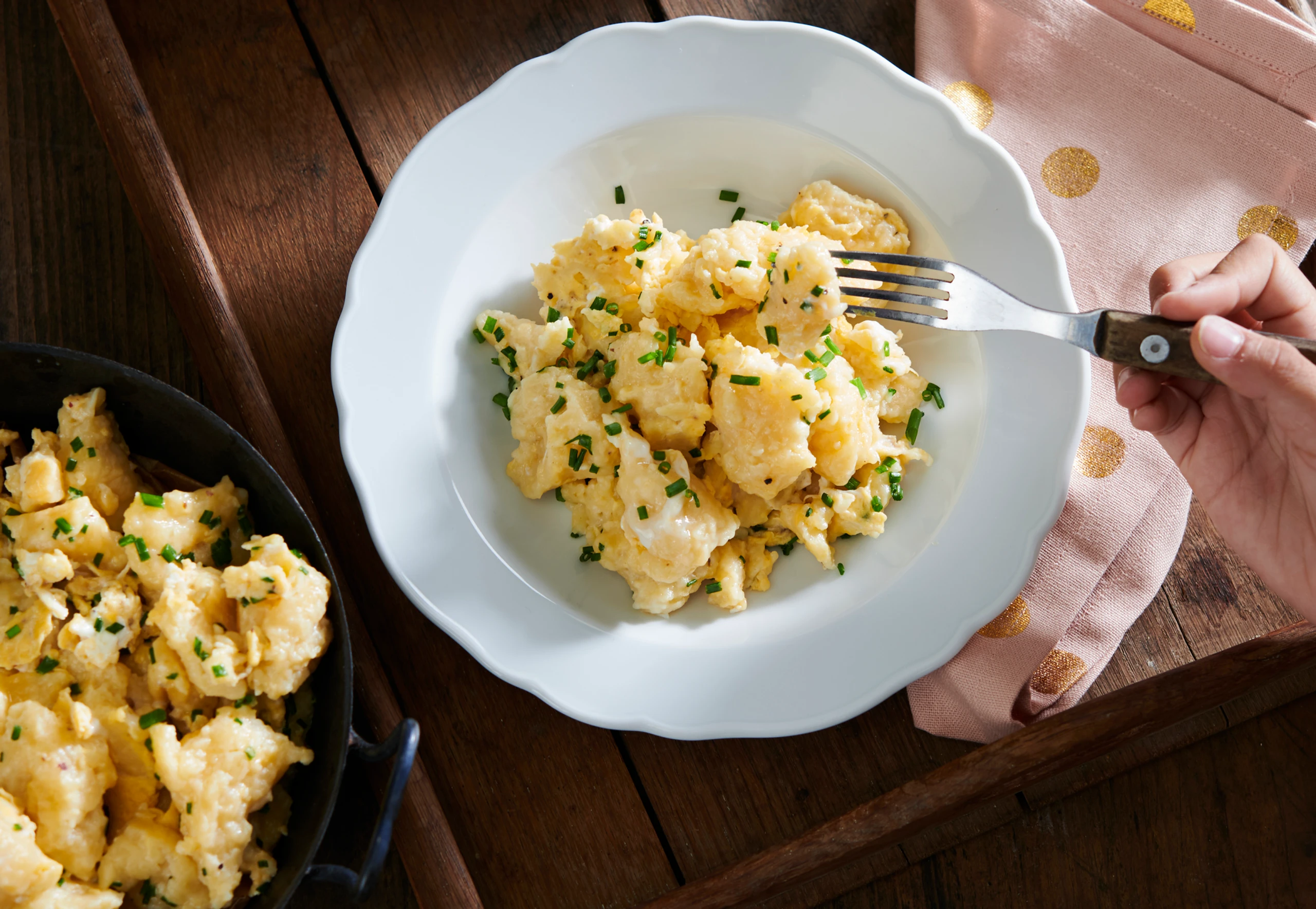 Für den Guss Schnittlauch schneiden. Eier mit Salz und Pfeffer verquirlen. Nockerl aus dem Wasser heben und abtropfen lassen. Butterin einer Pfanne aufschäumen, Nockerl darin kurz schwenken. Eiguss darüber gießen und anziehen lassen. Mit Schnittlauch bestreuen und mit dem Salat servieren.