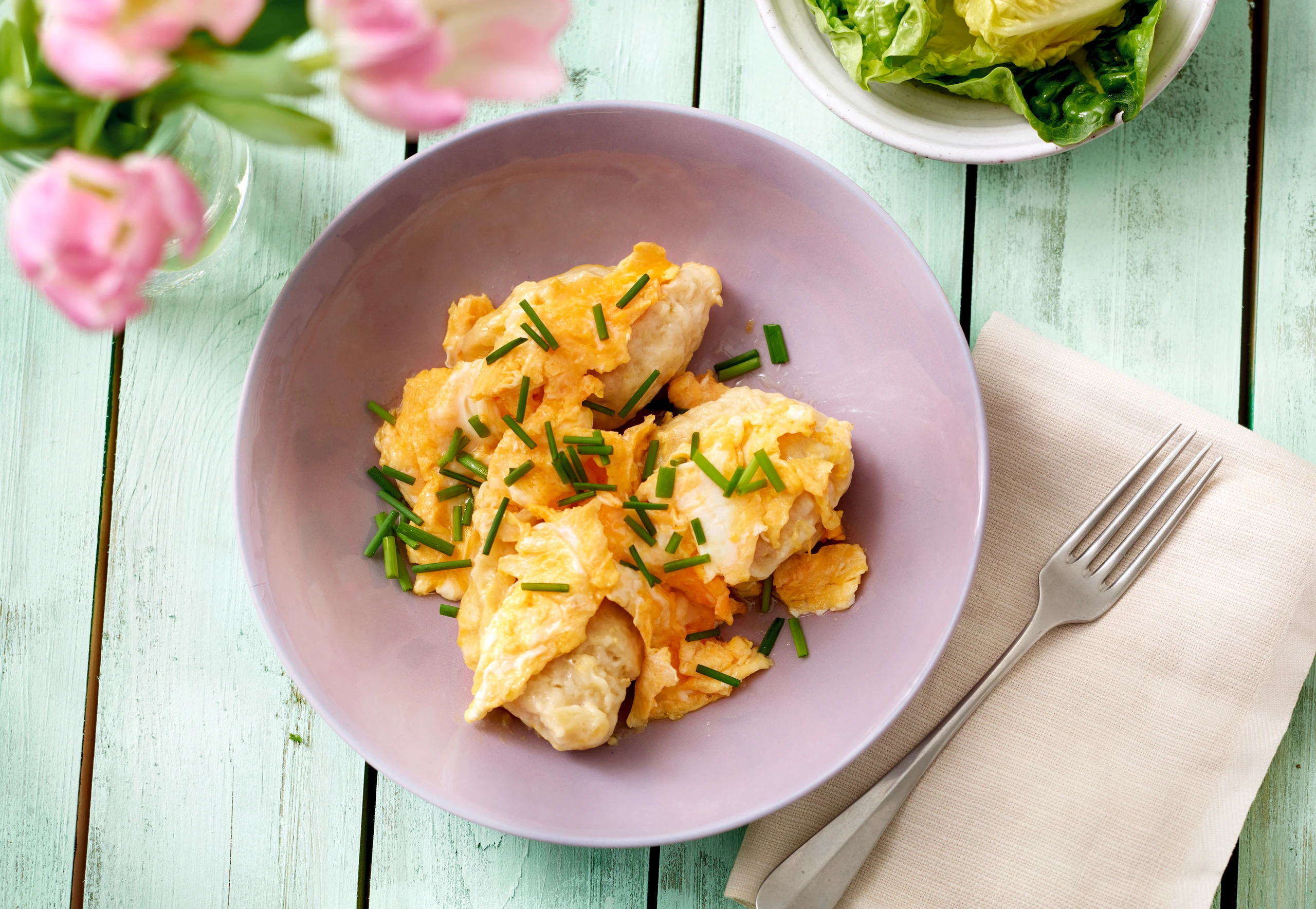 Für den Überguss Schnittlauch nicht zu fein schneiden. Eier mit Salz und Pfeffer schlampig verschlagen, es sollten noch „Eiweißnester“ erhalten bleiben.