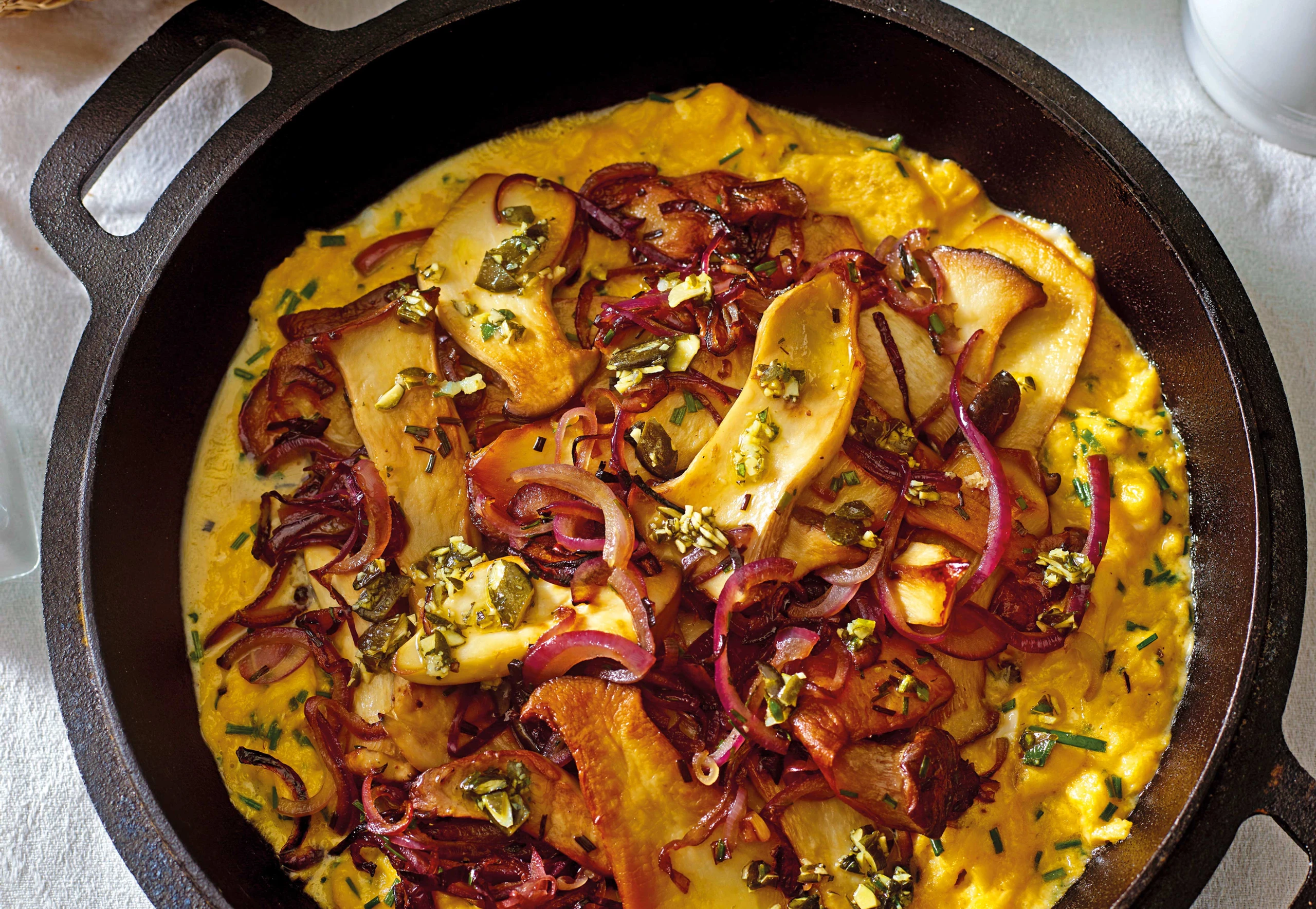 Eierpfandl mit Kräuterseitlingen und Kürbiskern-Gremolata